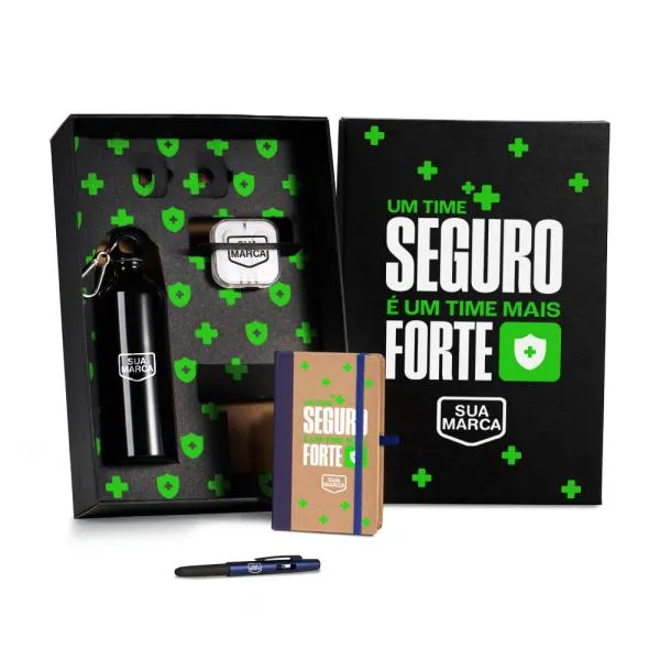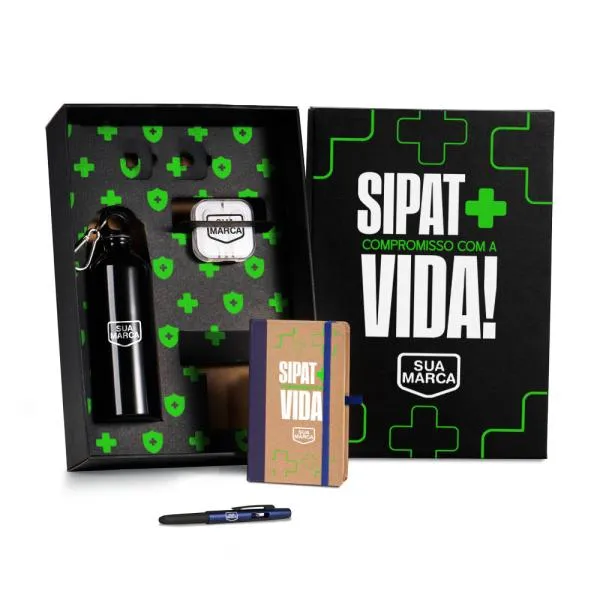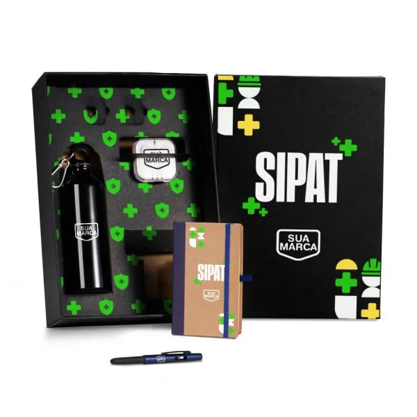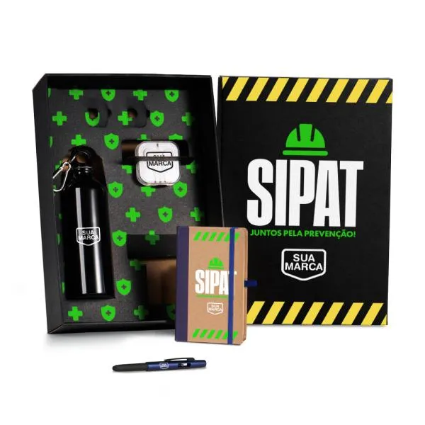 Kit para SIPAT corporativa com itens que cobrem comunicação, hidratação e anotações — tudo em uma embalagem organizada e com espaço para a identidade visual da sua empresa. Indicado para empresas que realizam a Semana Interna de Prevenção de Acidentes de Trabalho e buscam presentear colaboradores com um conjunto funcional e bem apresentado. Com a White Brindes, você visualiza o layout completo antes da produção e ainda pode conferir a qualidade pessoalmente no nosso showroom em Joinville.