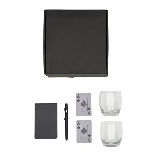 Kit para whisky e jogos. Conta com dois copos para whisky, baralho, caneta e bloco para anotações.