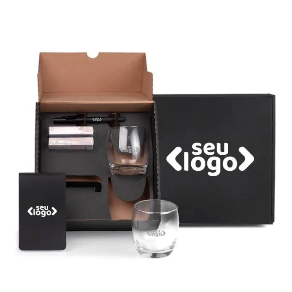 Um kit bem estruturado comunica o valor da empresa antes mesmo de ser aberto. O Kit Whisky e Jogos 6 Peças reúne dois copos para whisky, baralho, caneta e bloco de anotações em uma caixa preta de apresentação, formando um conjunto que equilibra sofisticação e descontração. Indicado para reconhecimento de profissionais, datas comemorativas corporativas e ações de relacionamento com clientes e parceiros. Com personalização a laser nos copos e silk/digital nos demais itens, sua marca aparece com qualidade em cada peça do conjunto — e a White Brindes cuida de tudo, do layout à entrega.
