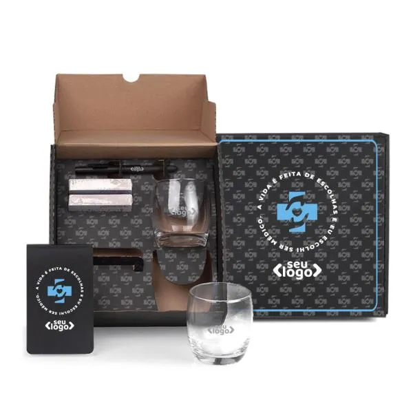 - Itens inclusos: 2 copos para whisky, 1 baralho, 1 caneta, 1 bloco de anotações e caixa de apresentação