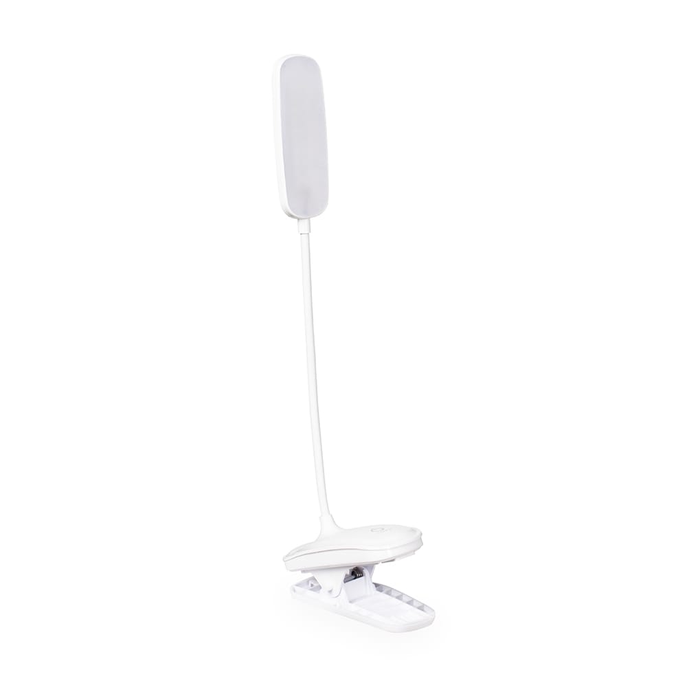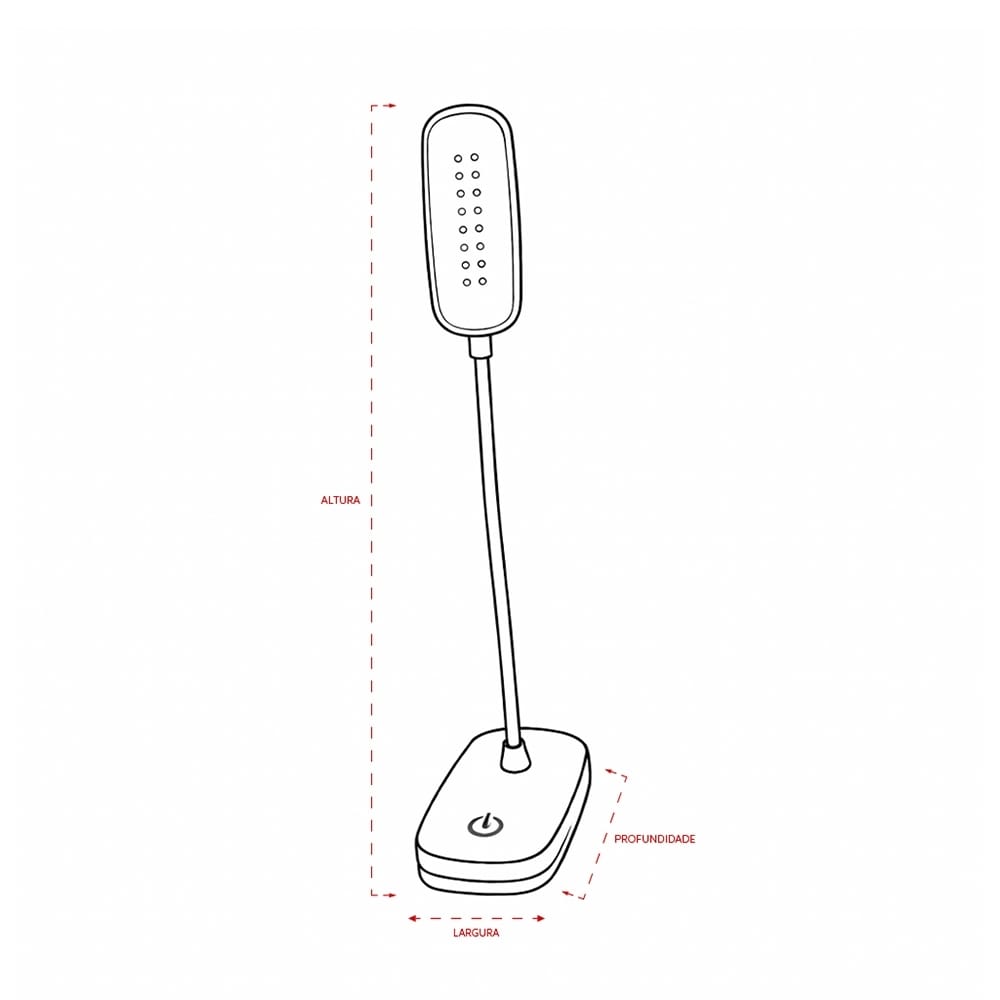 Luminária recarregável com 20 LEDs de cores mistas, sendo 10 quentes e 10 frios. Possui estrutura em plástico ABS com haste articulável em diferentes ângulos, presilha para fixação em superfícies planas e acionamento por toque na base para a seleção de três níveis diferentes de iluminação. Acompanha cabo USB-C para recarga.