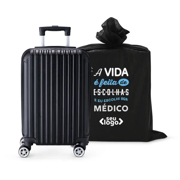 Uma mala de viagem personalizada comunica cuidado e atenção em um presente que tem uso real e frequente. Indicada para homenagens a profissionais da saúde, como no Dia do Médico, ou como reconhecimento para colaboradores e parceiros que viajam com frequência. Com personalização em laser na plaquinha de metal e gravação digital no saco de TNT, sua marca aparece com elegância em cada deslocamento — com a segurança de ver o produto no showroom ou aprovar o layout antes da produção.