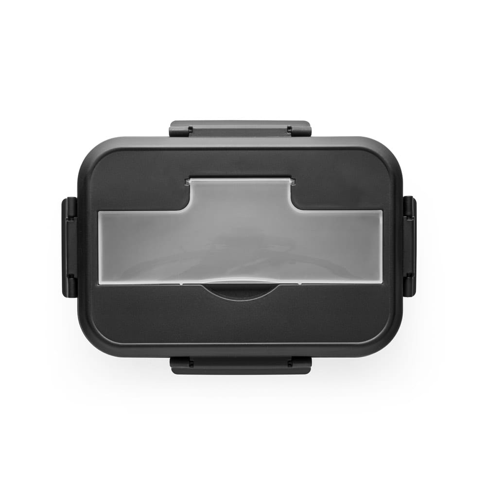 Marmita em PP, com tampa com compartimento para talheres (inclusos). A caixa é apta para micro-ondas, retirando a tampa. Não aconselhável para líquidos. Capacidade 1L. Certificação EU Food Grade