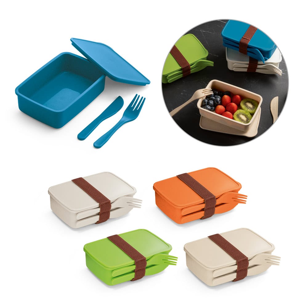 Marmita hermética em fibra de bambu (60%) e PP (40%) com compartimento com capacidade até 600ml. Contém banda elástica com suporte para 2 talheres, inclusos: garfo e faca. Apto para micro-ondas (retirar a tampa). Certificação EU Food Grade