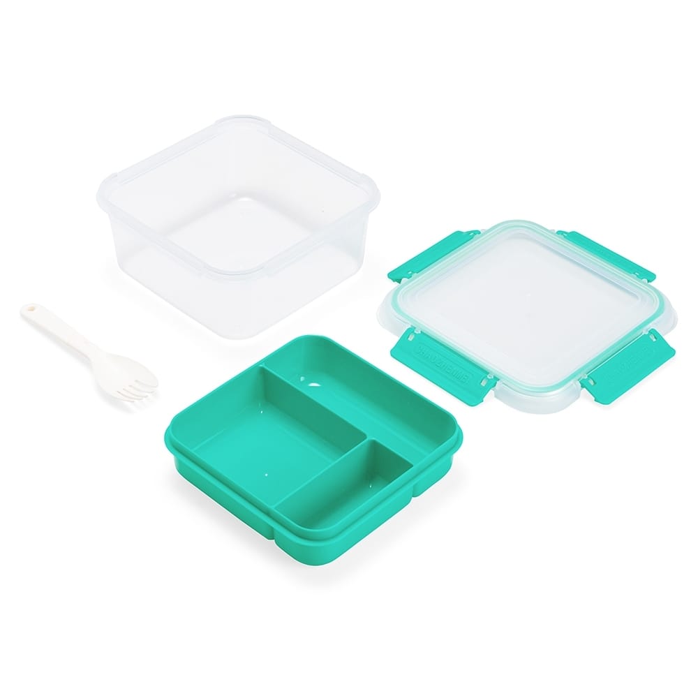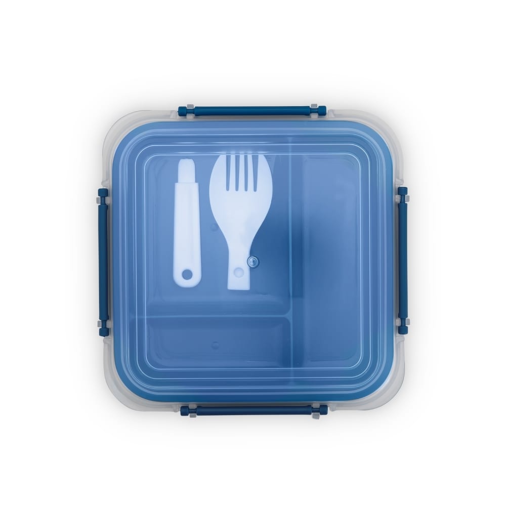 Marmita em plástico polipropileno (PP) livre de BPA com capacidade máxima de 1 litro combinada com a divisória removível. Possui tampa hermética com anel de vedação em silicone e quatro travas laterais. Acompanha colher tipo spork em PP.