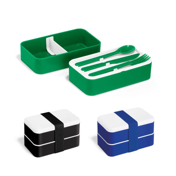 Marmita em PP e PS com 2 compartimentos (680ml cada) e 1 divisória removível. Incluso 3 talheres: garfo, faca e colher. Fecha com banda elástica e está apta para micro-ondas, retirando a tampa. Caixa branca 93852 vendida opcionalmente. Certificação EU Food Grade