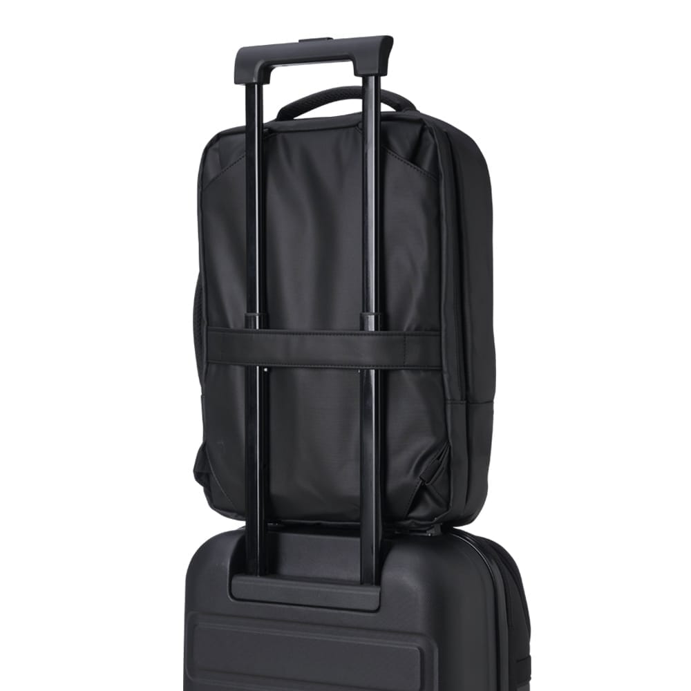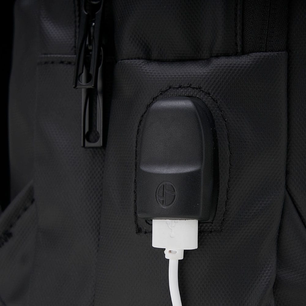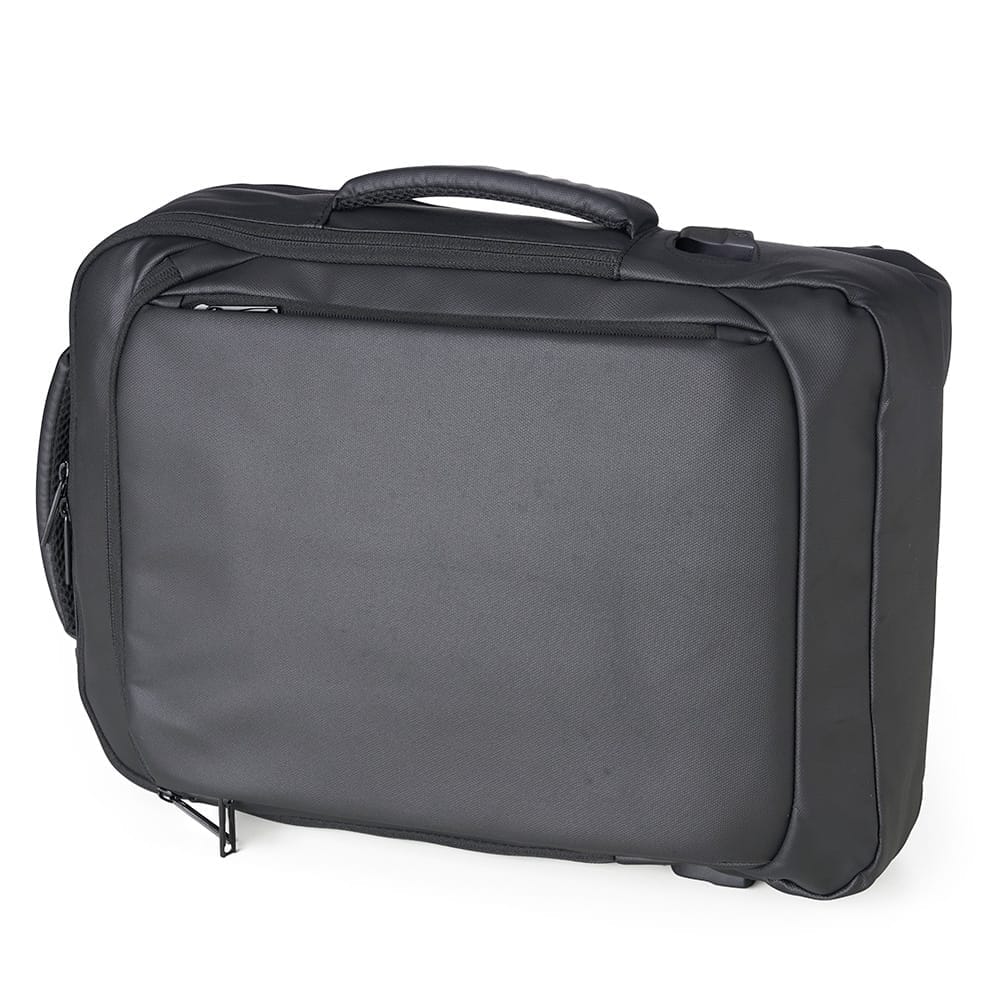 Mochila em couro sintético 17 litros resistente à água com cinco compartimentos, sendo o principal com bolso para notebook 15,6. Com divisórias internas para acessórios, a mochila possui suporte externo usb, alça para encaixe em malas de viagem e duas alças de mãos, sendo uma delas lateral para o transporte da mochila no modo pasta.