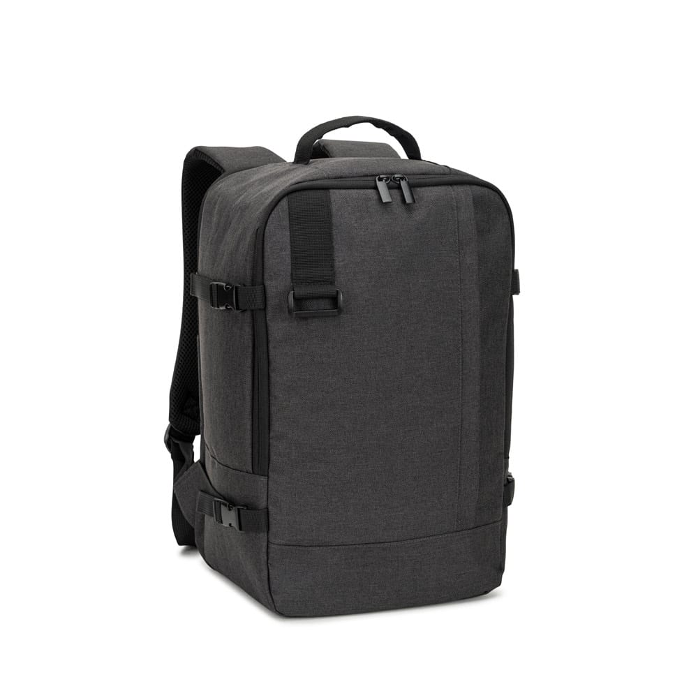 Mochila desenvolvida para cumprir as dimensões exigidas pelas companhias aéreas, permite-lhe viajar com tudo o que necessita como bagagem de mão. Composta em poliéster reciclado (rPET) Oxford de alta densidade, com acabamento repelente à água, e forro em poliéster reciclado (rPET) Nylon. Possui um compartimento principal amplo para roupa, um compartimento totalmente almofadado para um notebook até 14″ e um bolso frontal. A mochila oferece-lhe um maior conforto nas suas viagens devido à sua pega superior almofadada, cintas de compressão nas laterais que lhe permite ajustar a dimensão da mochila ao seu volume e a parte posterior em malha com alça para trolley. A parte frontal dispõe de uma peça para pendurar um objeto, como por exemplo um Squeeze com mosquetão. Capacidade até 20L