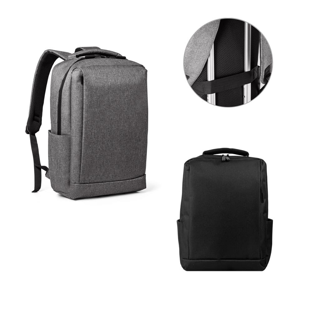 Mochila para notebook em Poliéster de alta densidade com 2 divisórias almofadadas para notebook até 15,6″ e tablet 10,5″ e diversos bolsos interiores. Tem ainda bolso frontal, 2 bolsos laterais e banda para transporte em trolley. Parte posterior e alças são almofadadas. Capacidade até 14L