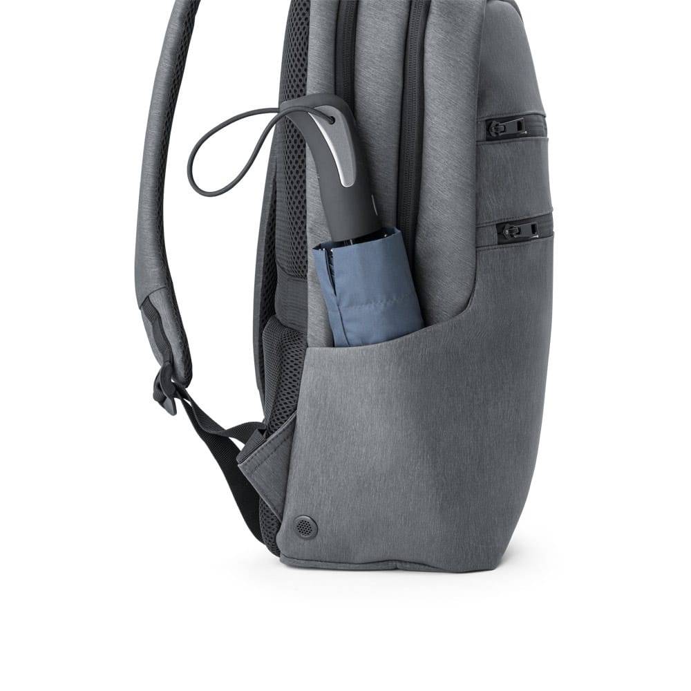 Mochila para notebook em Nylon 2Tone impermeável com 2 compartimentos e alças almofadadas. Possui um compartimento posterior com 2 divisórias almofadadas com fecho em velcro para notebook até 17” e tablet até 10.5”, um compartimento frontal com diversos bolsos interiores, dois bolsos na parte frontal, tendo um deles bloqueio RFID. Nas laterais existe um bolso para squeezes em elastano e outro para o guarda-chuva, com ilhós perfurados para evitar acumulação de água. A parte posterior almofadada tem bolso oculto e banda para transporte em trolley. Placa metálica removível com imã para fácil gravação. Capacidade até 14L