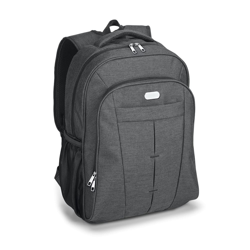 Mochila para notebook em Oxford de alta densidade com compartimento forrado, com divisória almofadada para notebook até 17” e diversos bolsos interiores. 2 bolsos laterais em tela mesh e 2 bolsos frontais. Parte posterior almofadada, com sistema de apoio acolchoado para as costas e alças almofadadas. Placa metálica removível com imã para fácil gravação. Capacidade até 24L