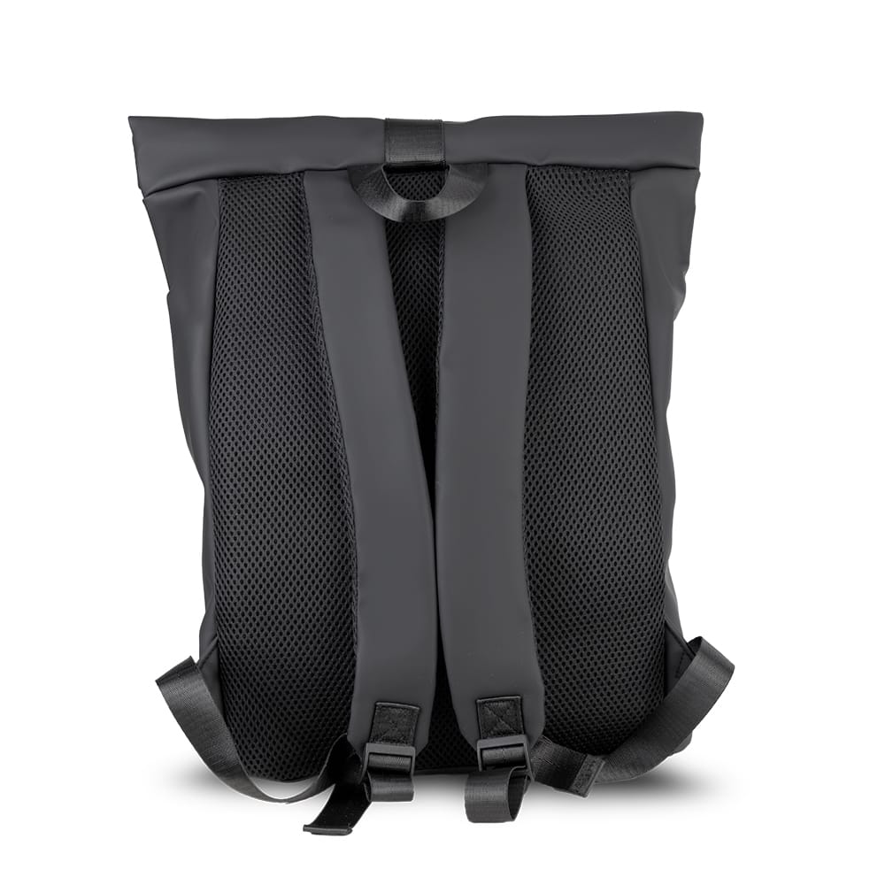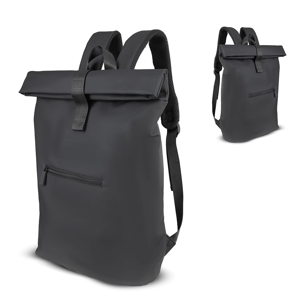 Mochila em 100% PU com interior em poliéster 210D e capacidade de 16,5L. Possui compartimento principal com zíper e alça de fechamento em velcro, compartimento frontal com zíper, espaço para notebook de até 15,6”, alça de mão e alça de ombro acolchoada.