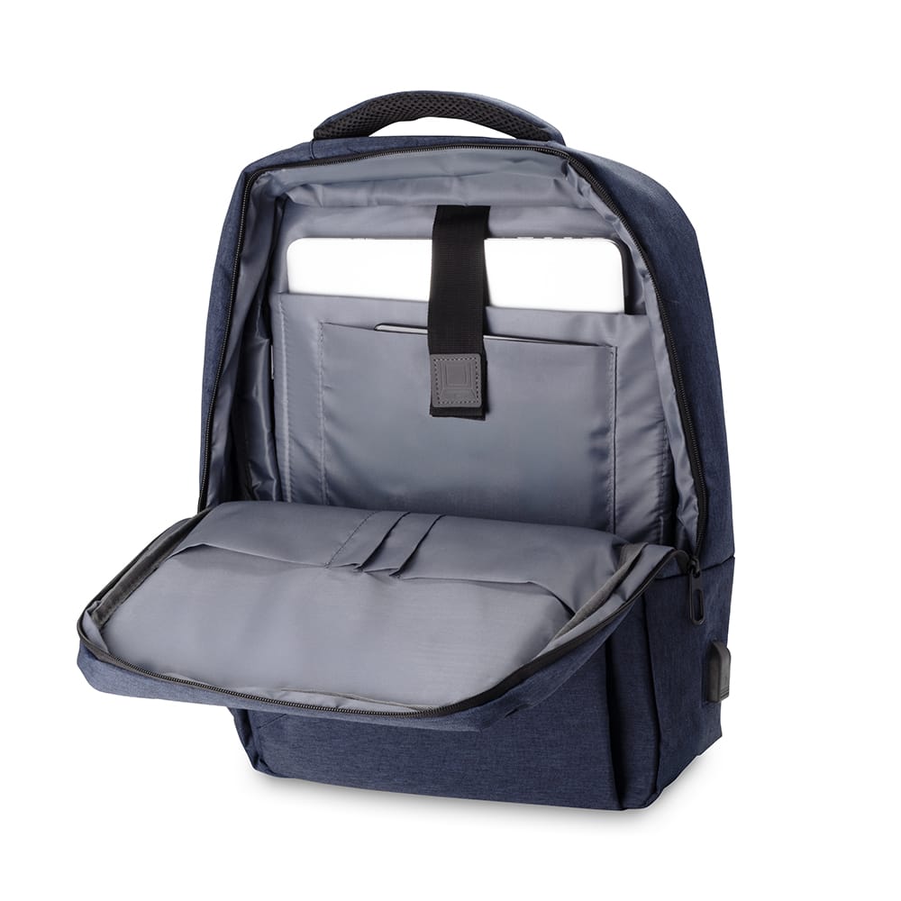 Mochila para notebook de até 15,6” com expansor, confeccionada em tecido externo de poliéster 600D e tecido interno de poliéster 210D. Possui conector USB na lateral, compartimento frontal com zíper e compartimento principal com divisórias para pequenos objetos, chaves, tablet e notebook de até 15,6”. Conta ainda com engate para mala de viagem, além de alças de mão e de ombro acolchoadas.