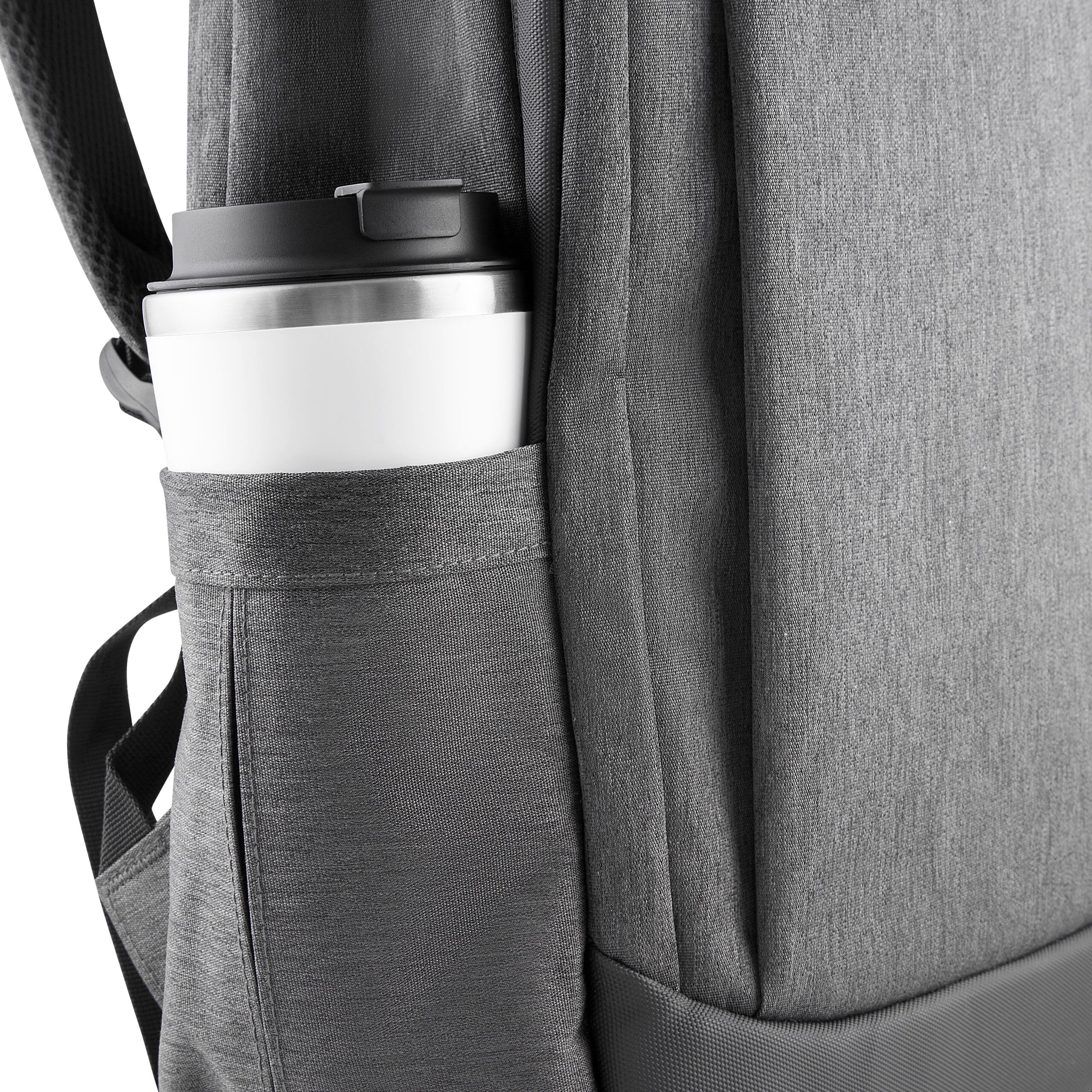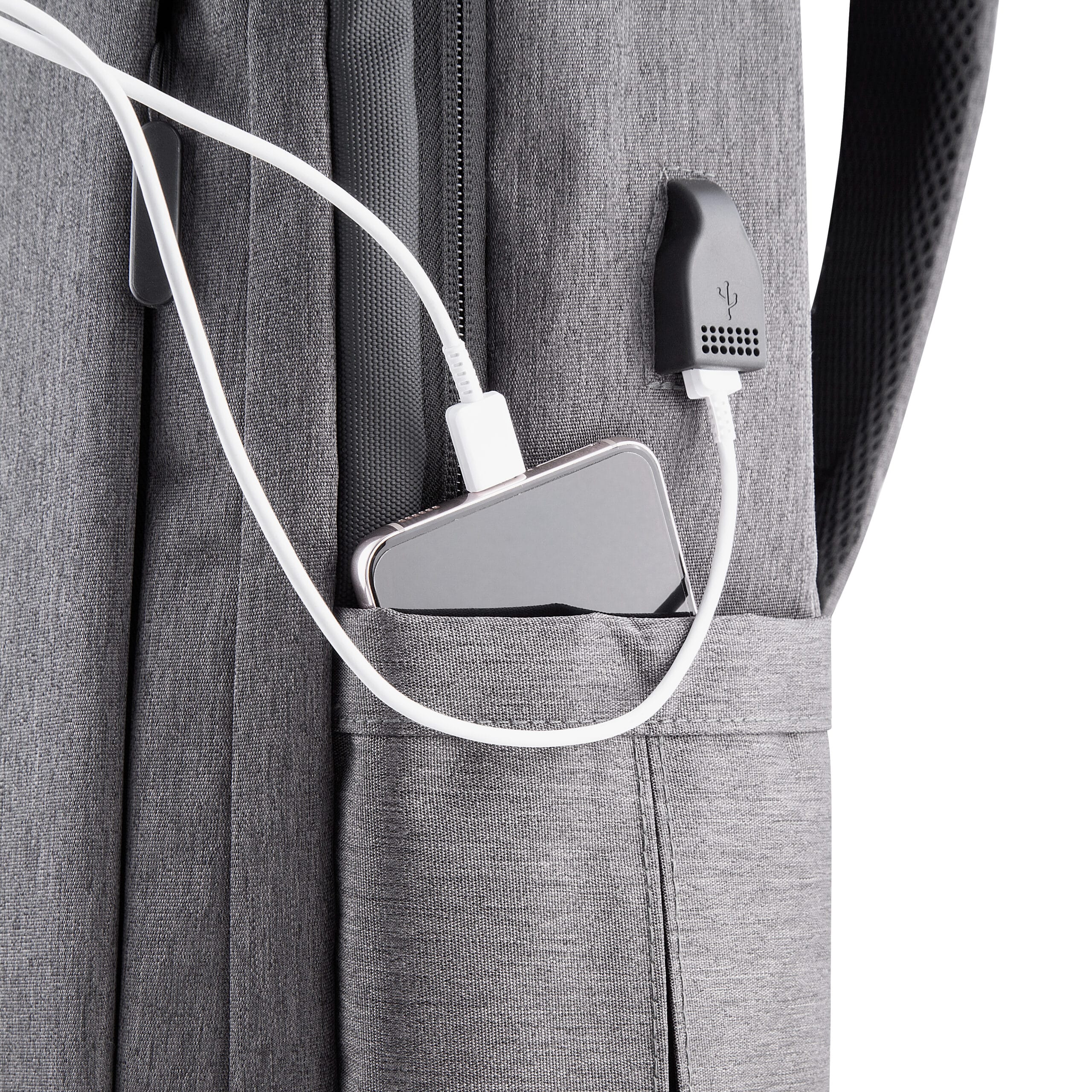 Mochila em tecido Oxford com detalhe em PU e interior em poliéster 190D, capacidade de 21L. Possui conector USB lateral, bolso frontal com zíper, dois bolsos laterais, compartimento interno para notebook de até 15,6” e tablet, divisórias internas, alça de mão, alça de ombro acolchoada e engate para mala de viagem.