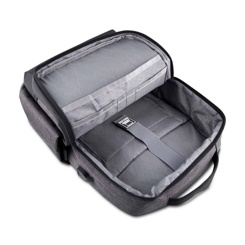 - Compartimento para tablet: Espaço dedicado separado do notebook