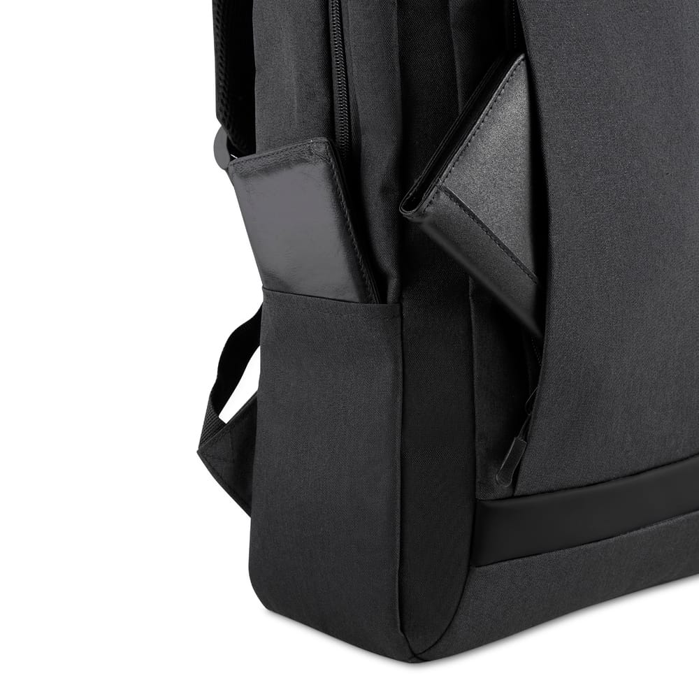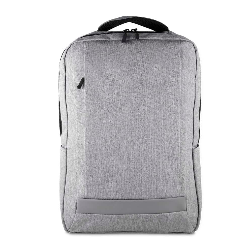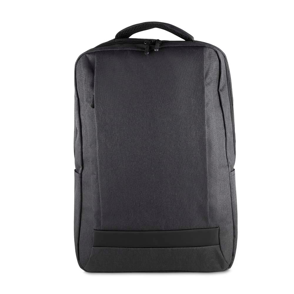 Mochila confeccionada em tecido externo de poliéster 300D com detalhe em PU e tecido interno em poliéster 210D, com capacidade total de 13,5 litros. Possui bolso frontal com fechamento em zíper, dois bolsos laterais e compartimento interno para notebook de até 15,6”.