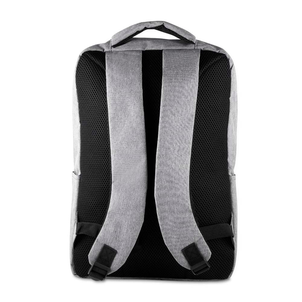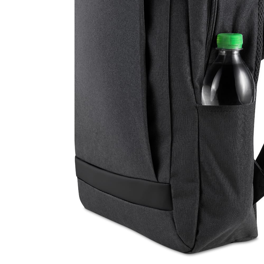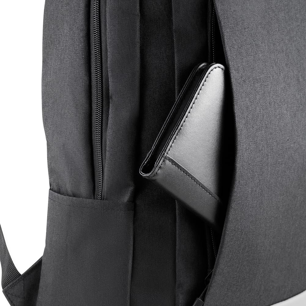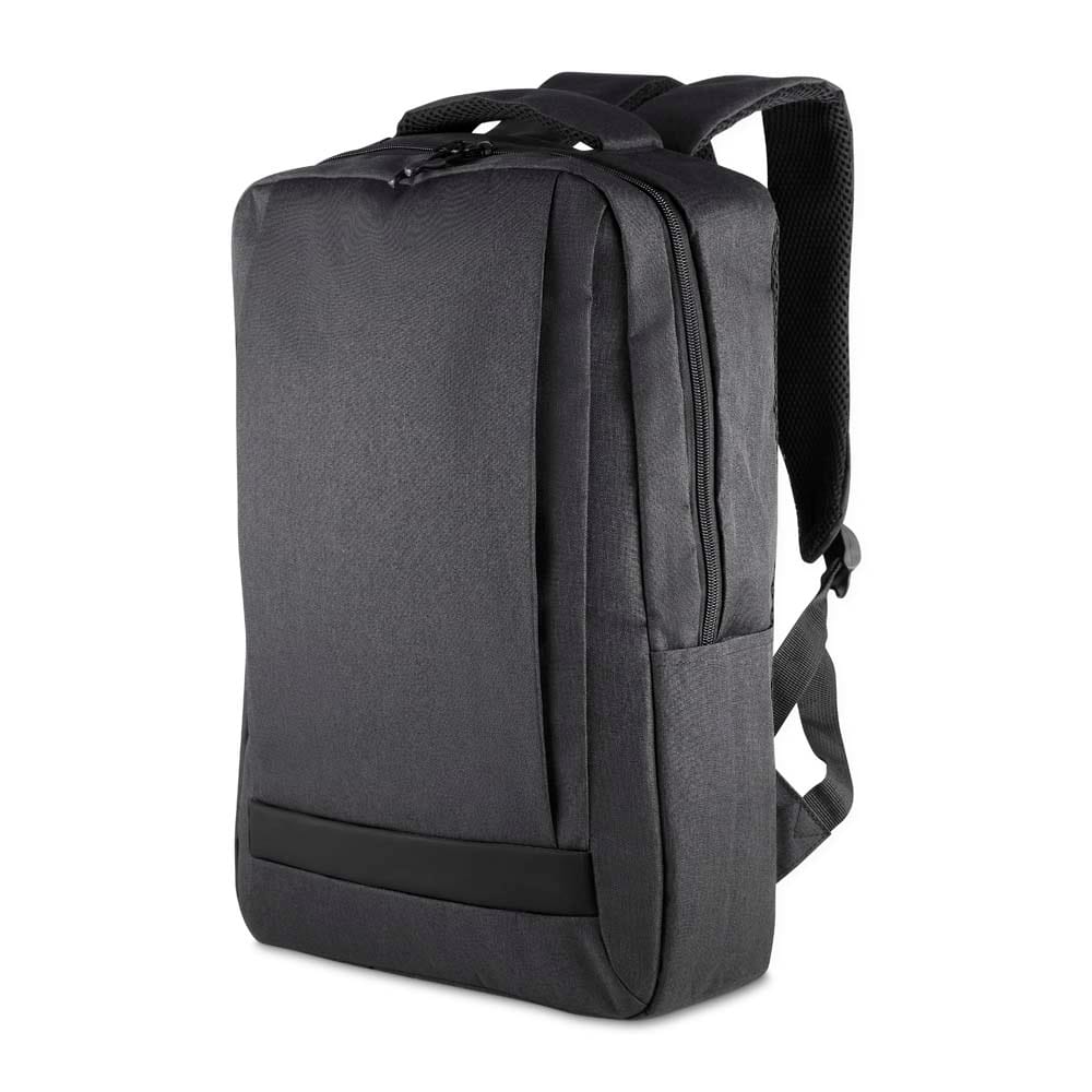 Mochila confeccionada em tecido externo de poliéster 300D com detalhe em PU e tecido interno em poliéster 210D, com capacidade total de 13,5 litros. Possui bolso frontal com fechamento em zíper, dois bolsos laterais e compartimento interno para notebook de até 15,6”.