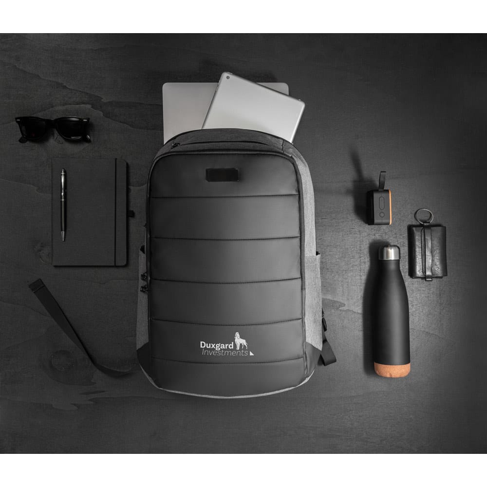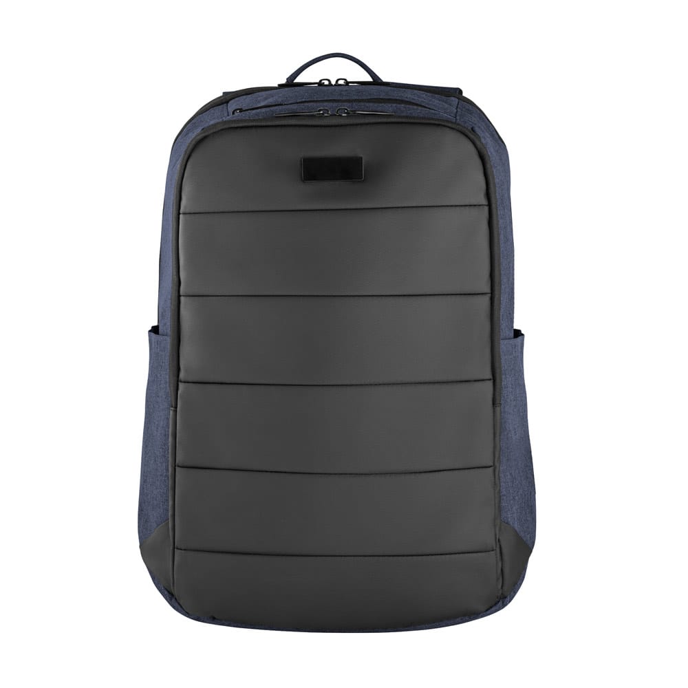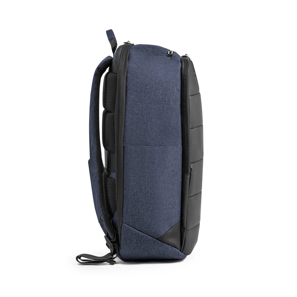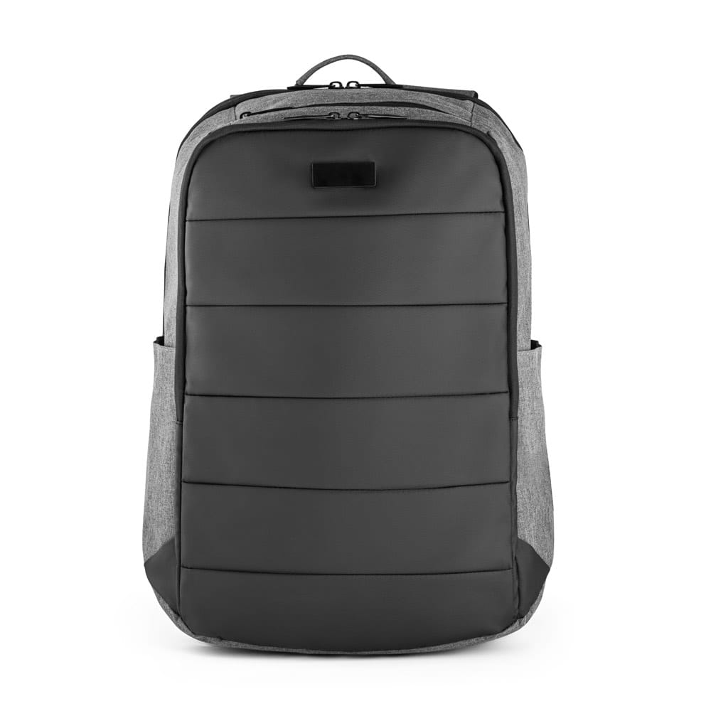Mochila para notebook em Poliéster de alta densidade. Possui um compartimento posterior com 2 divisórias almofadadas para notebook até 17’’ e tablet até 9,7’’, dois bolsos nas alças (1 com zíper), bolso oculto nas costas da mochila com zíper, bolso no topo com zíper e bolsos laterais em tela. Contém tira de transporte para trolley, alças e parte posterior almofadadas e painel frontal com acabamento soft touch. Placa metálica removível com imã para fácil gravação. Capacidade até 21L