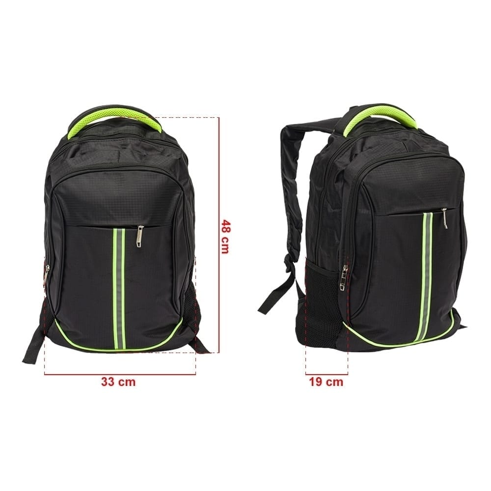 Mochila de nylon 26 Litros com três compartimentos, sendo o principal com bolso para notebook de 15,6. A mochila possui bolsos laterais em malha e faixa reflexiva na parte frontal.
