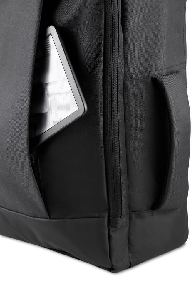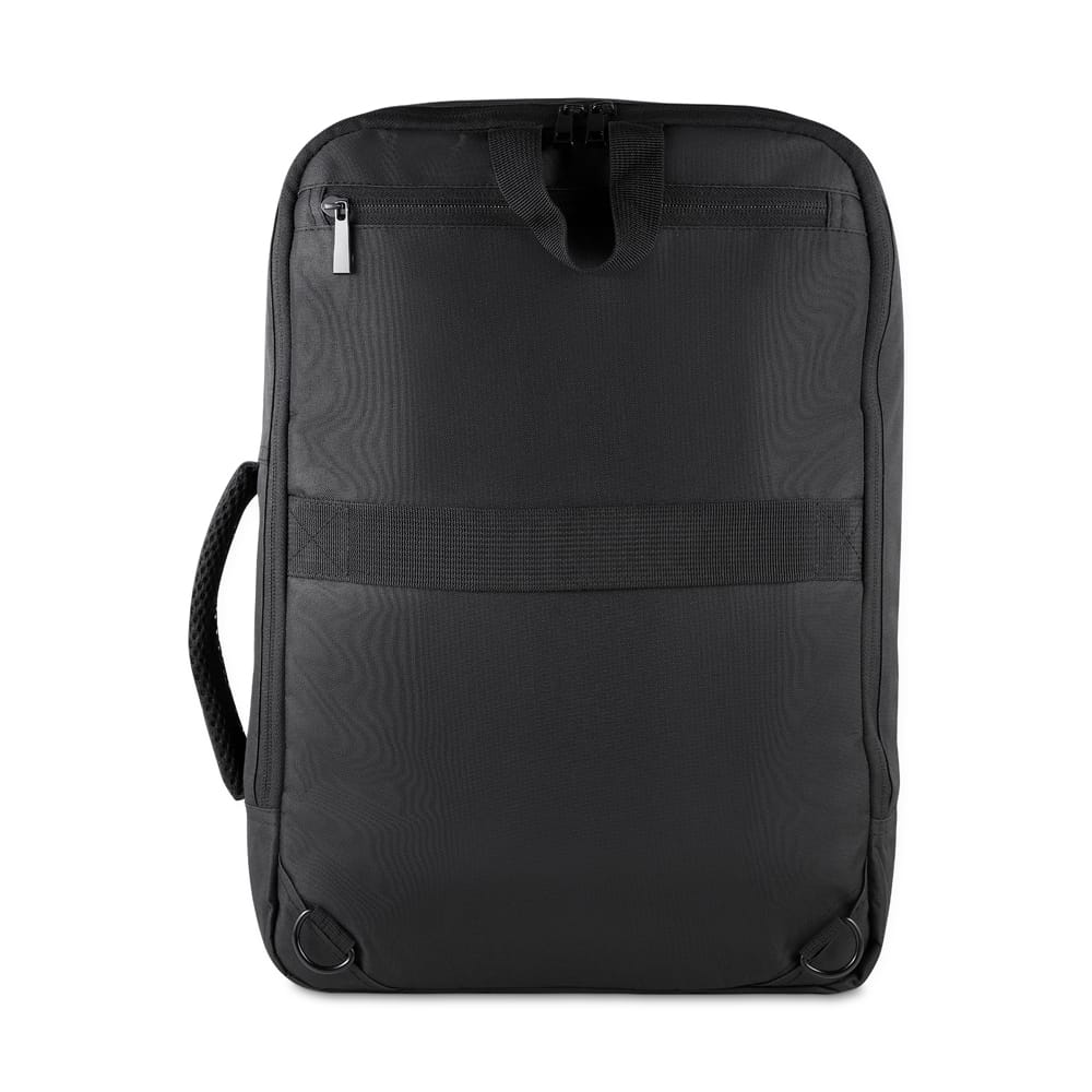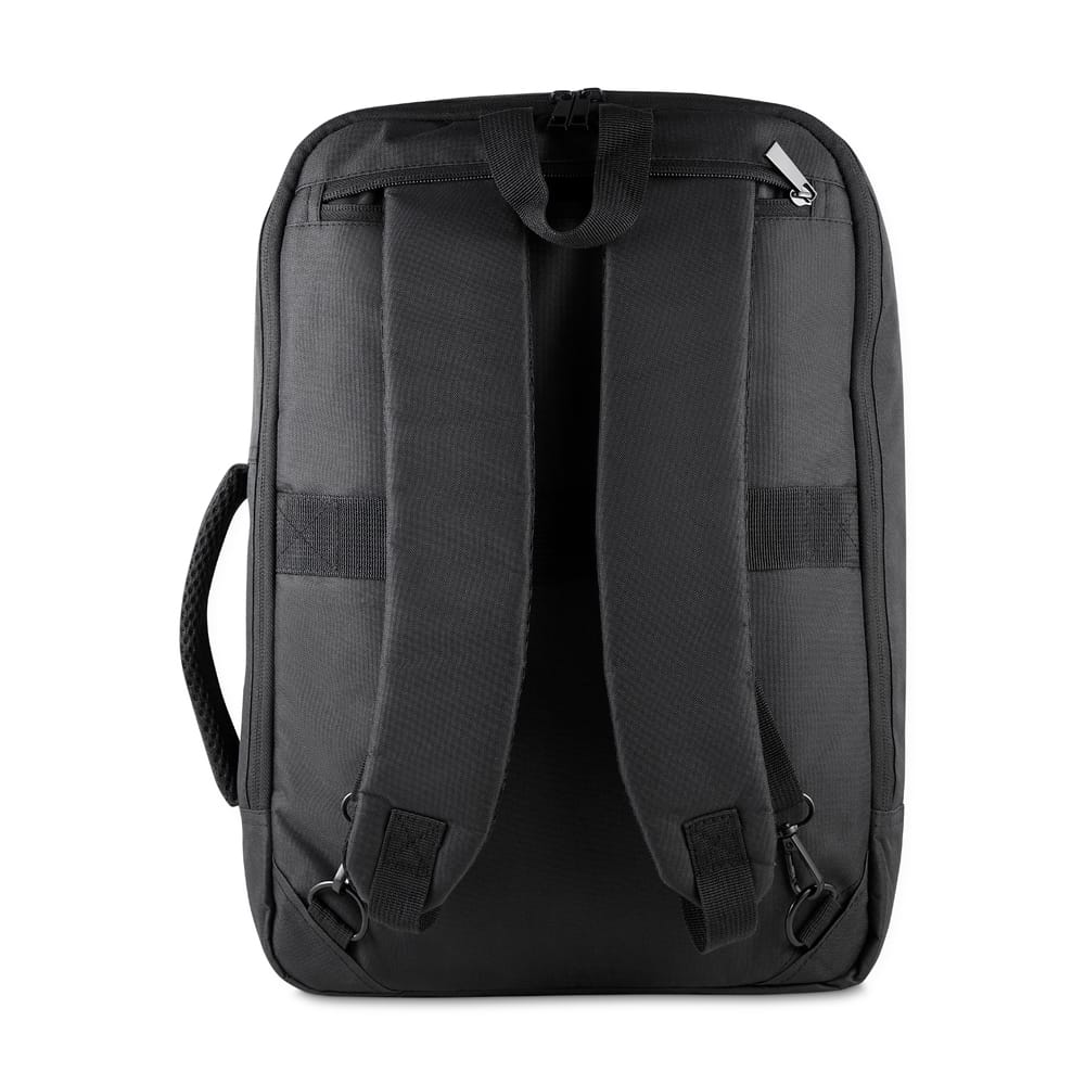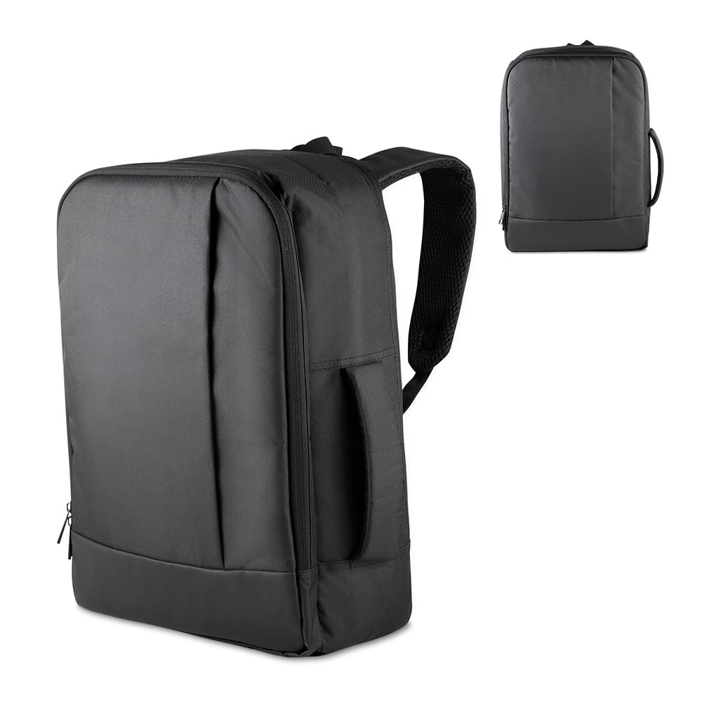 Mochila/pasta em poliéster 300D com detalhe em PU e interior em poliéster 210D. Possui alças lateral e de ombro acolchoadas, alça de mão, engate para mala de viagem, bolso frontal com zíper, compartimento interno para notebook até 15,6” e bolso traseiro para ocultar as alças.