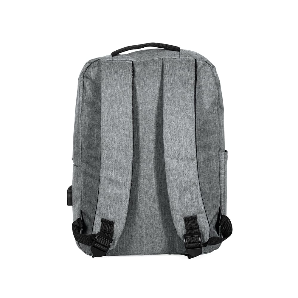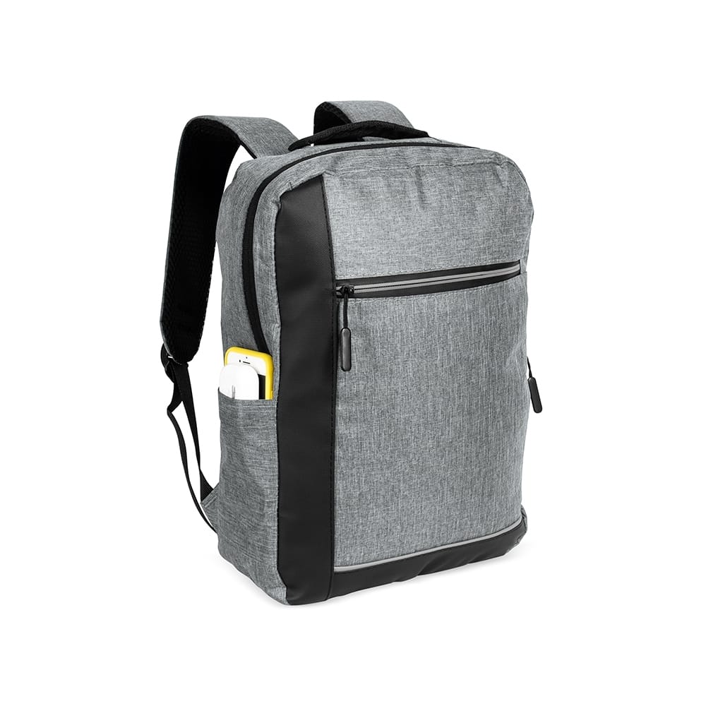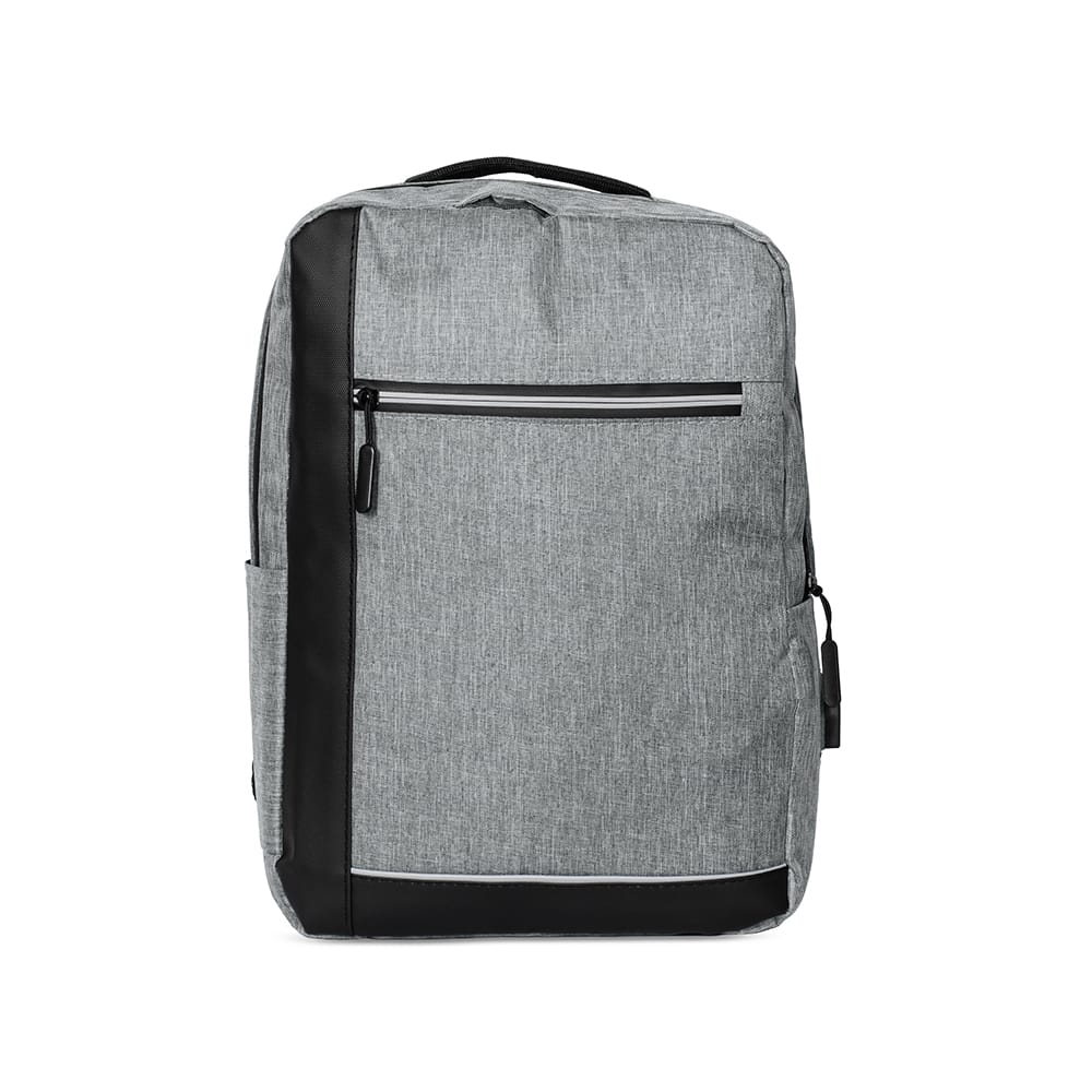 Mochila confeccionada em poliéster 300D resistente à água, com detalhes em couro sintético, fechamento em zíper e capacidade para até 15 litros. Possui compartimento principal com bolsos em diferentes tamanhos e divisória para notebooks de até 15.6 polegadas. Dispõe ainda de compartimento frontal com fechamento em zíper e faixa reflexiva, além de bolso lateral aberto e adaptador USB externo.