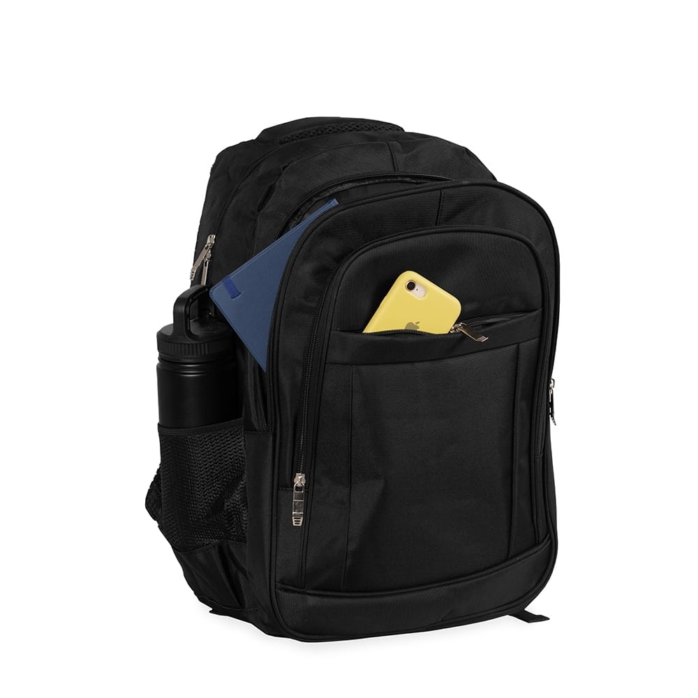 Mochila confeccionada em poliéster 900D impermeável, com fechamento em zíper e capacidade para até 32 litros. Possui compartimento interno com divisória para notebooks de até 17,3 polegadas. Conta ainda com três compartimentos frontais em tamanhos diferentes e dois bolsos laterais em malha com elástico, além de revestimento em tecido respirável na parte posterior, nas alças para as costas e na alça de mão.