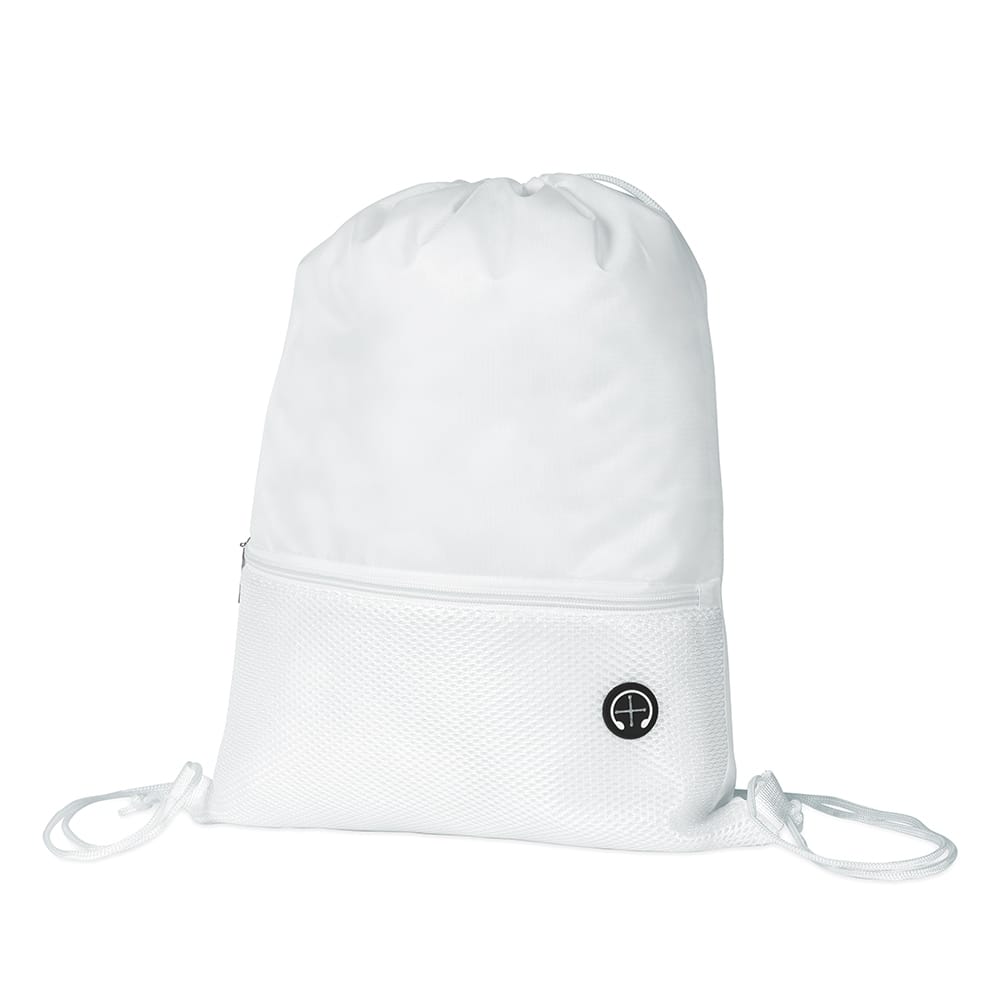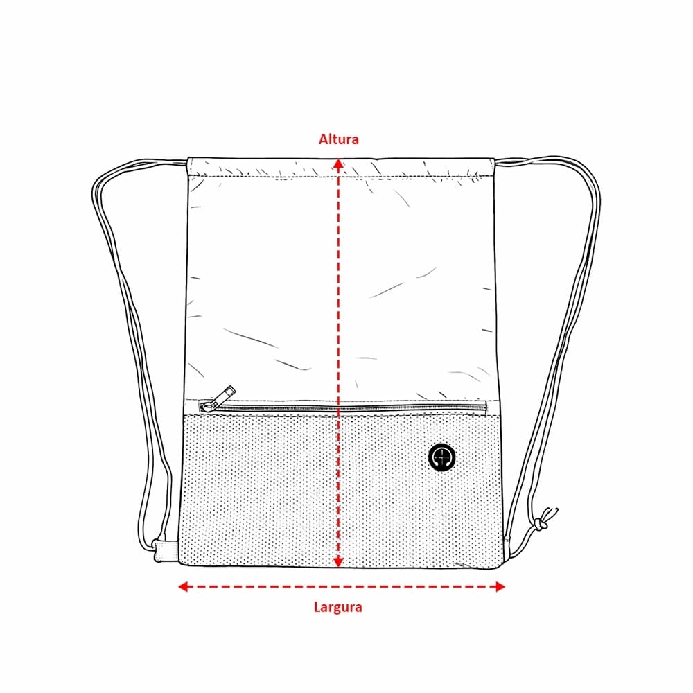 Mochila saco confeccionada em poliéster 420D com bolso externo em malha com entrada para fones de ouvido e alças ajustáveis em nylon.