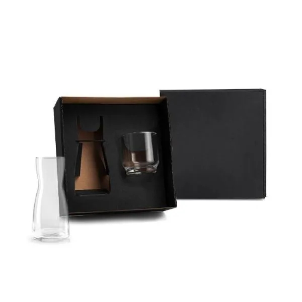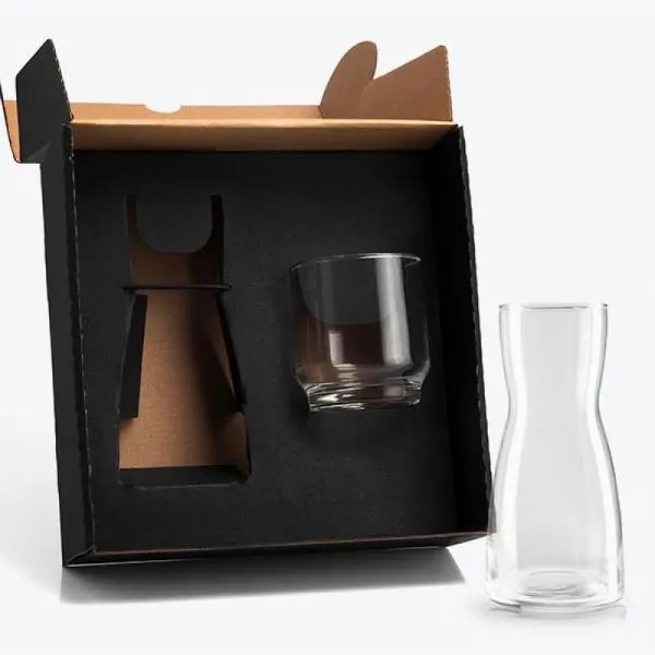 Kit contendo uma moringa de vidro e um copo acomodados em embalagem para presentear.