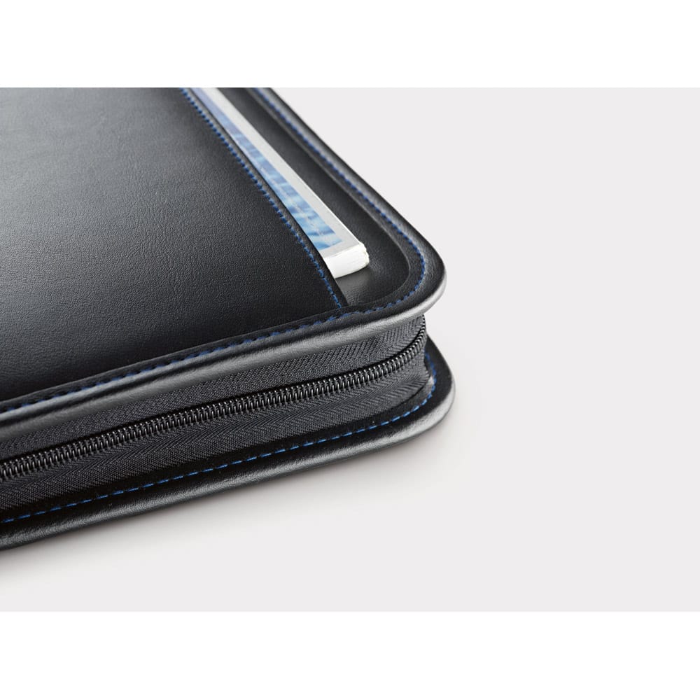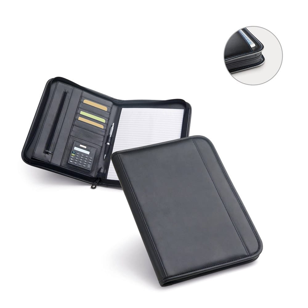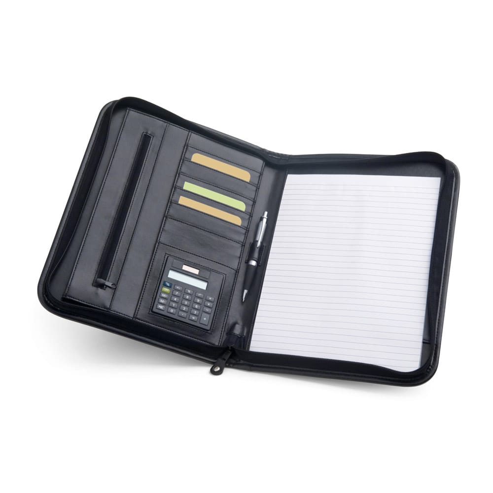 Pasta A4 em c. sintético, com bolso frontal e fecho. O interior contém um bloco de 40 páginas pautadas, suporte para Caneta (não inclusa), vários bolsos e calculadora dual-power de 8 dígitos, com pilha LR1130 inclusa