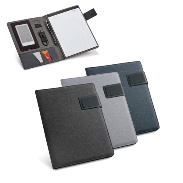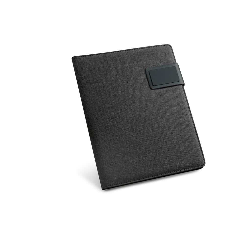 Pasta A5 em linho sintético e c. sintético com fecho magnético. O interior contém um bloco de 40 páginas pautadas, suporte para Caneta (não inclusa) e outros compartimentos para acessórios (não inclusos)