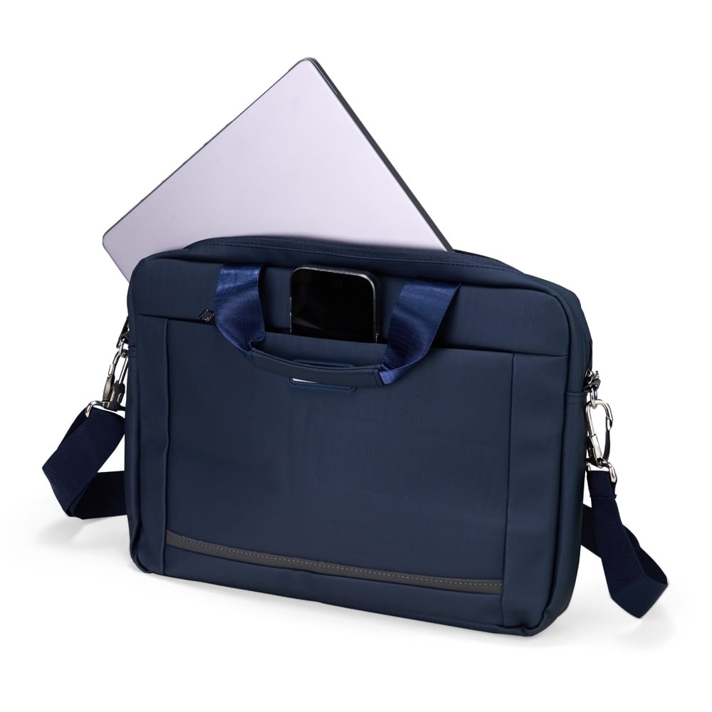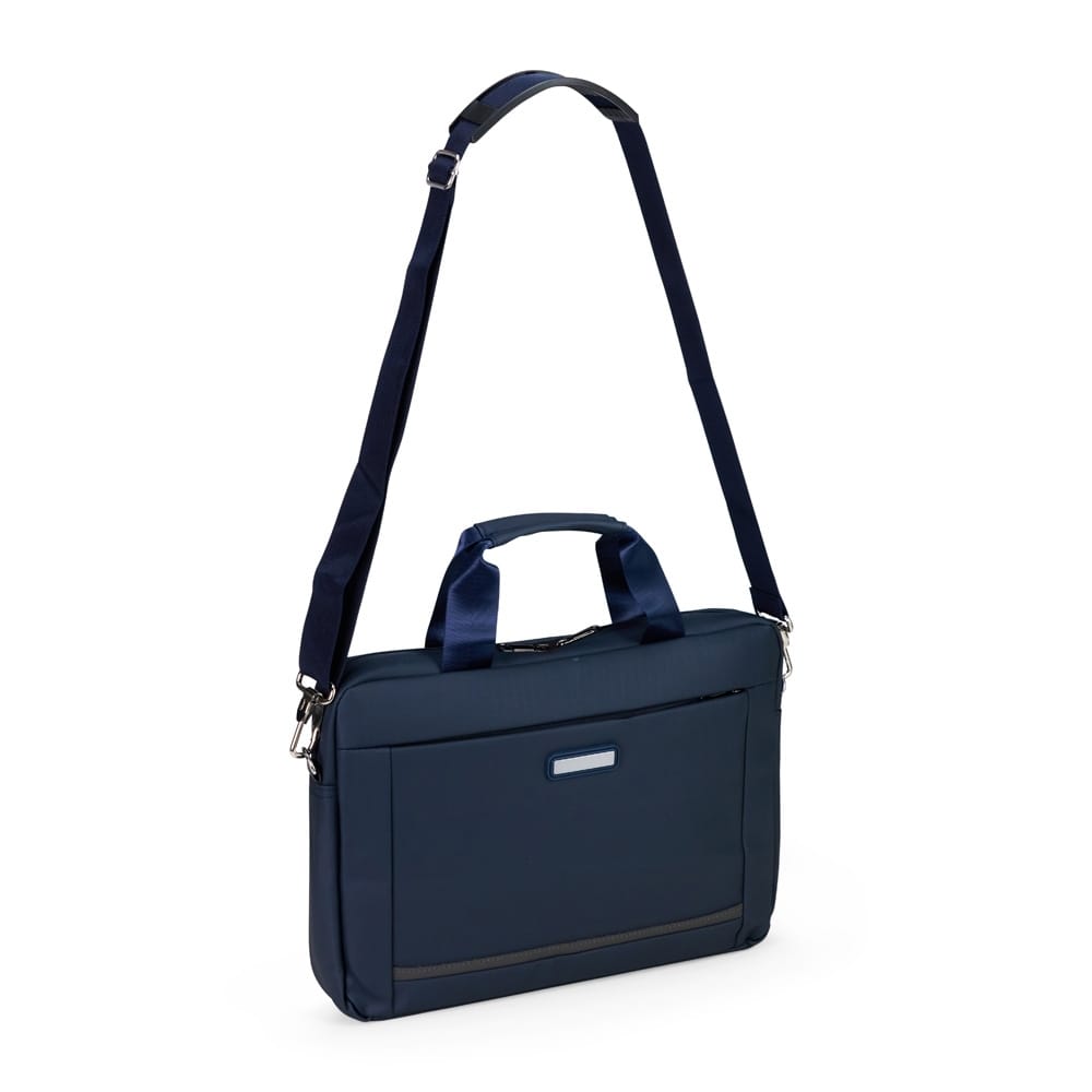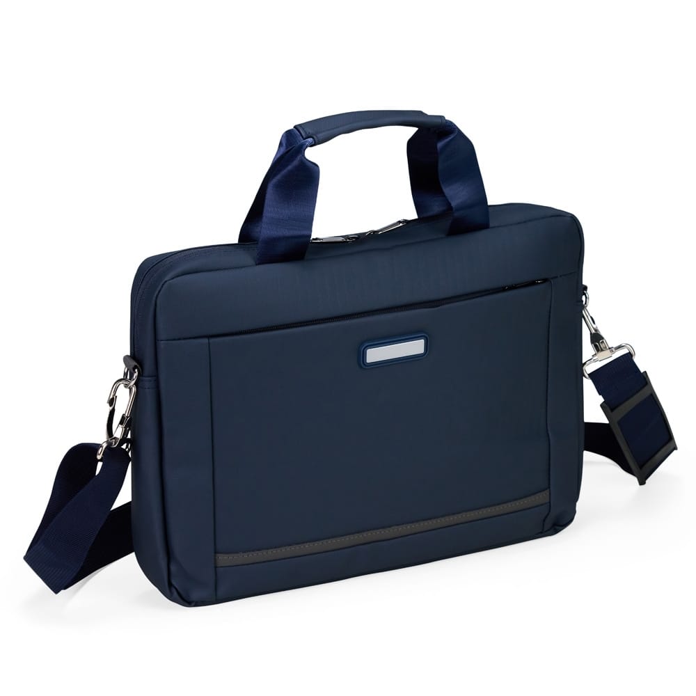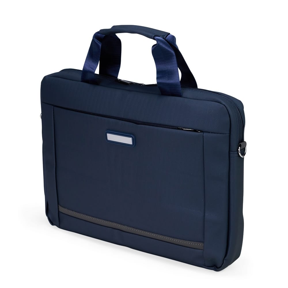 Pasta para notebook confeccionada em couro sintético impermeável com fechamento em zíper e capacidade para aparelhos de até 15,6 polegadas. Possui dois compartimentos: o principal, com revestimento acolchoado, quatro bolsos abertos de tamanhos diferentes e duas divisórias para canetas; e o frontal, com plaquinha metálica fixa na parte externa. Conta ainda com duas alças de mão e um par de abas metálicas para alças removíveis. Acompanha alça de ombro ajustável.