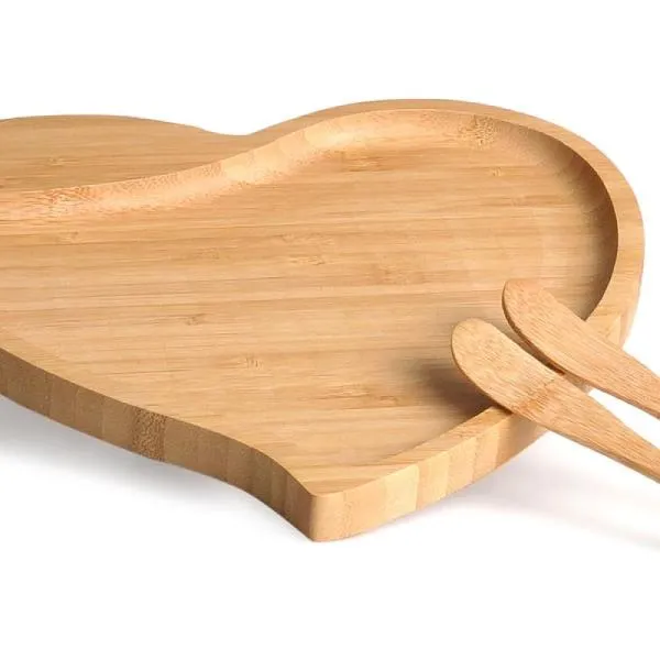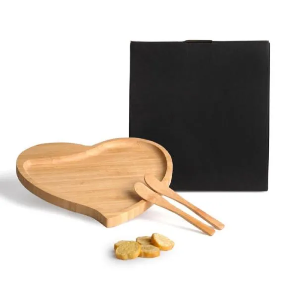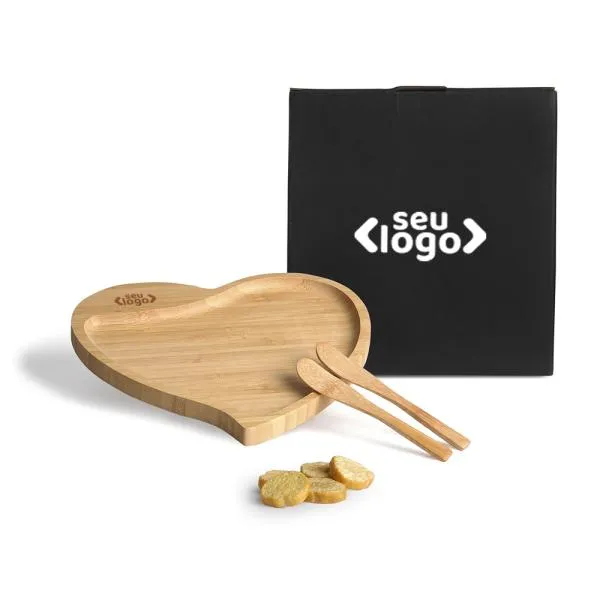 Petisqueira em bambu com formato de coração e duas espátulas de 14 cm.
