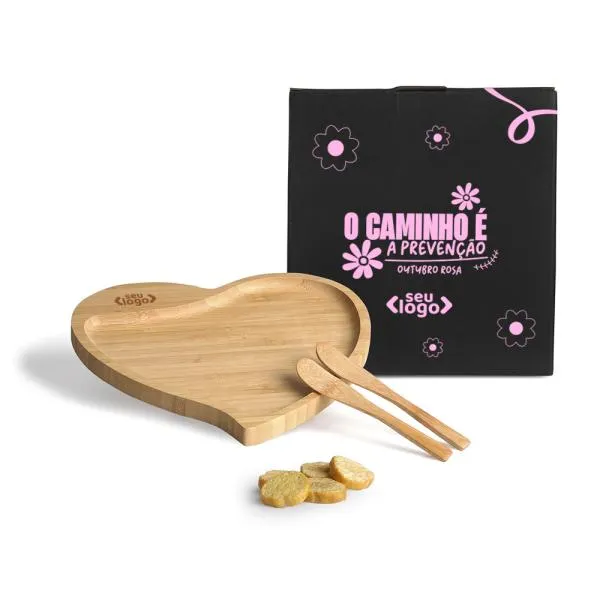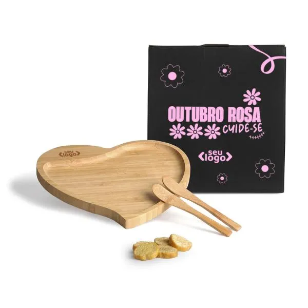 Petisqueira Em Bambu Com Formato De Coração Com Espátulas – Outubro Rosa
