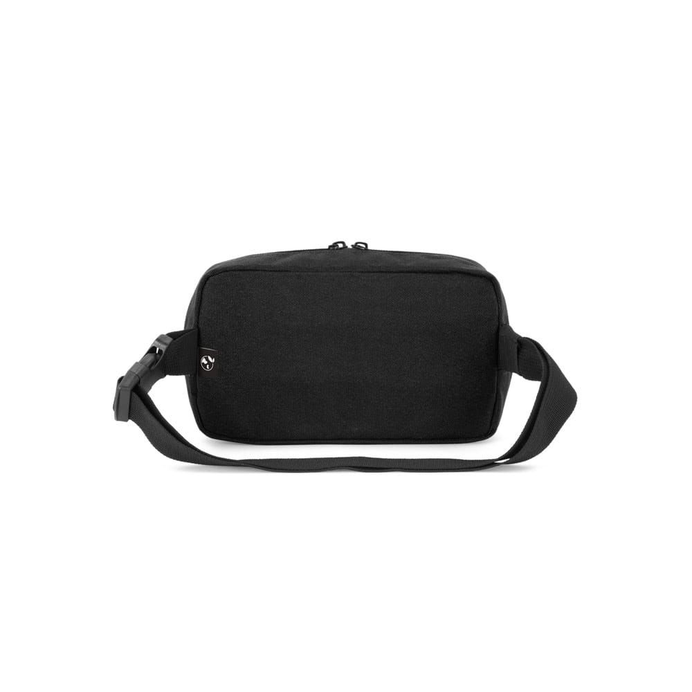 Pochete em poliéster reciclado Oxford e forro em poliéster reciclado Nylon. Possui um compartimento principal e um bolso frontal