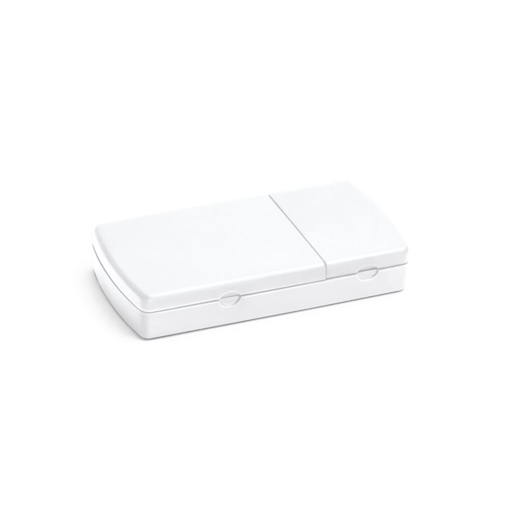 Porta comprimidos com tampa, 2 divisórias e cortante. As divisórias são extraíveis e coloridas, facilitando a sua distinção. Certificação EU Food Grade