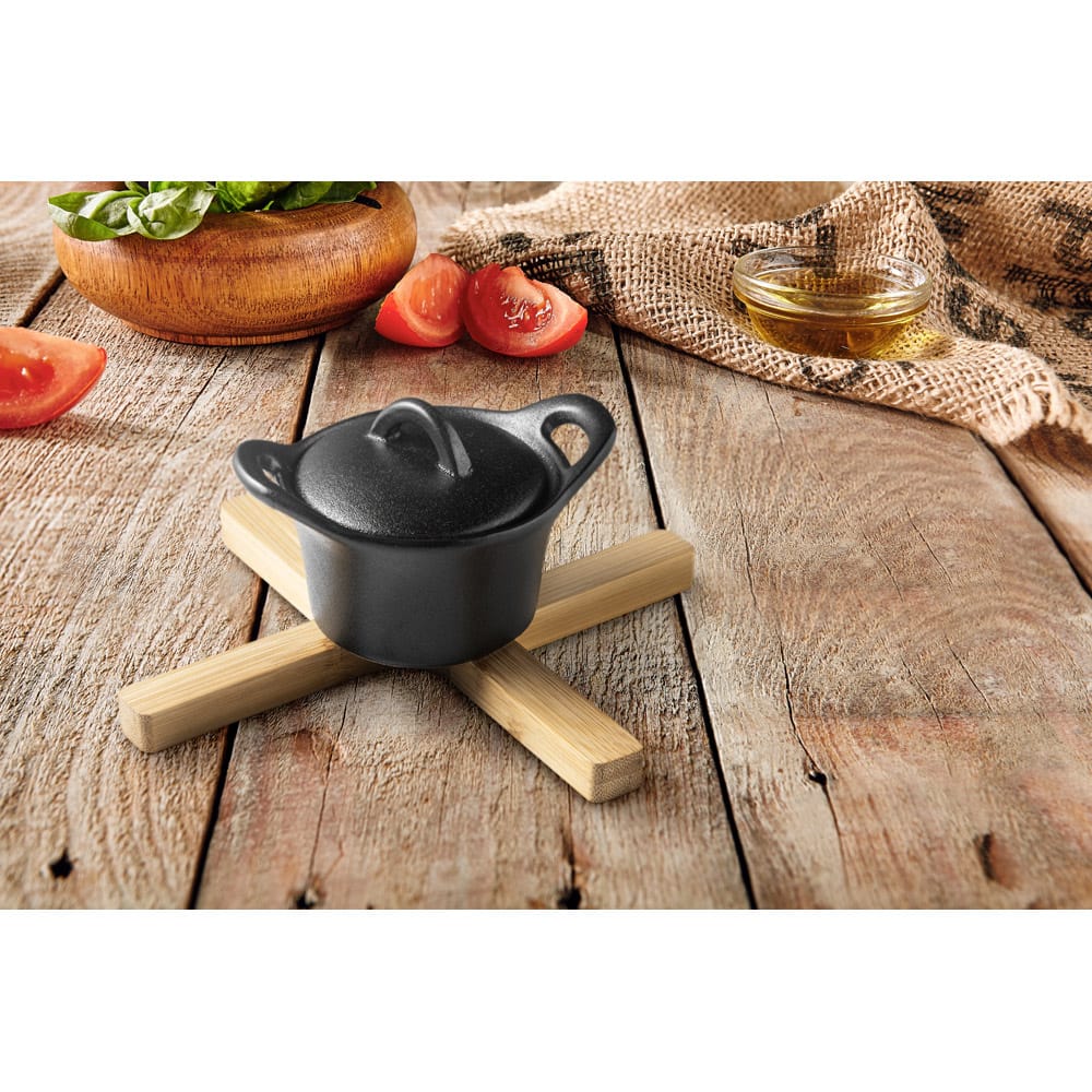 Descanso de panela dobrável em bambu. Fornecido em caixa oferta em papel kraft reciclado. A cor e o resultado da impressão nos materiais naturais pode variar entre produtos