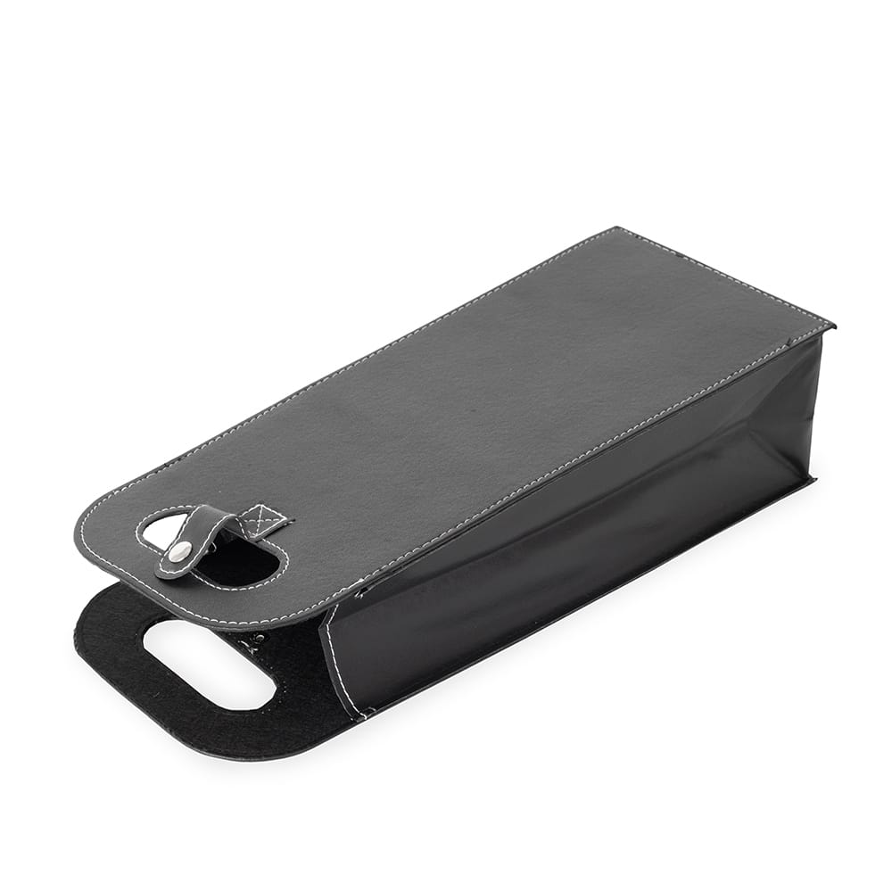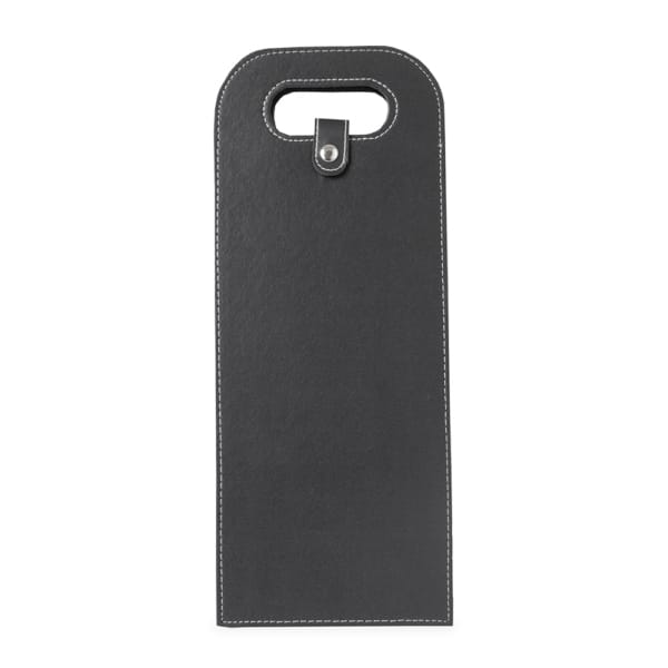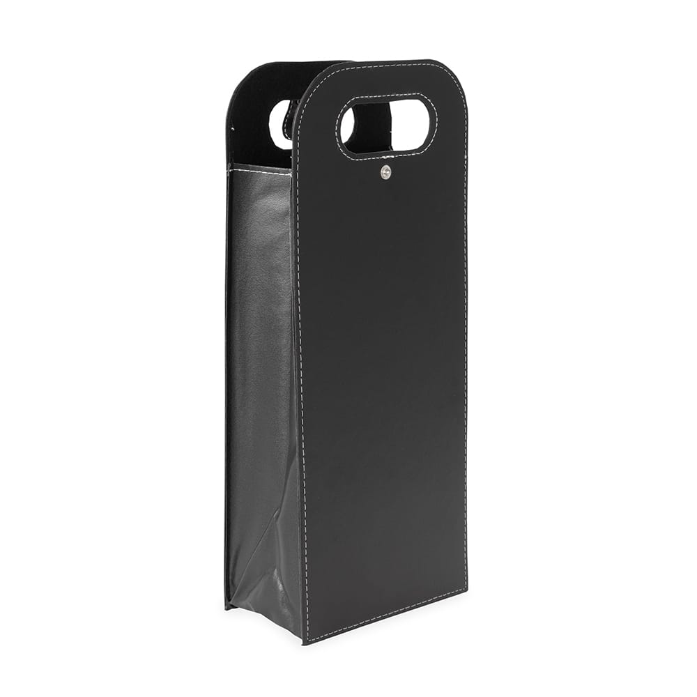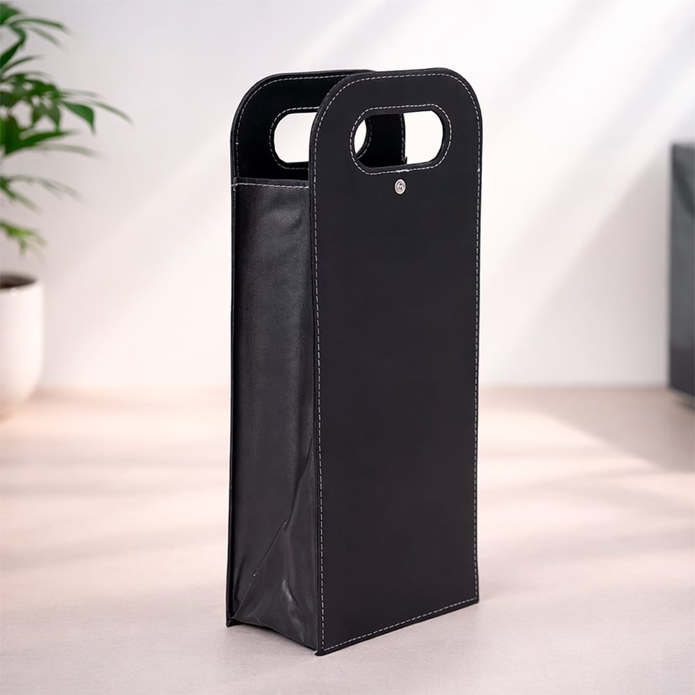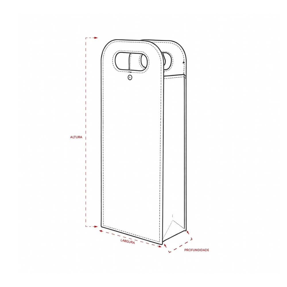 Porta-vinhos duplo em couro sintético com estrutura interna em papelão. Possui alça de mão vazada, fechamento em botão metálico e divisória removível em papelão.