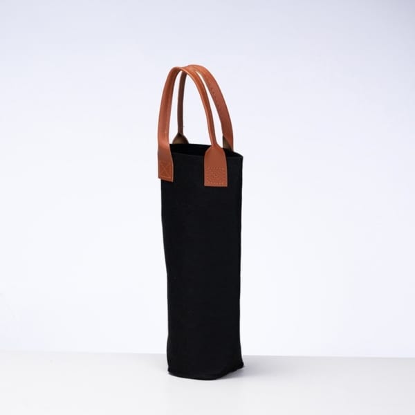 Sacola porta-vinho confeccionada em feltro e alças de mão em couro sintético.
