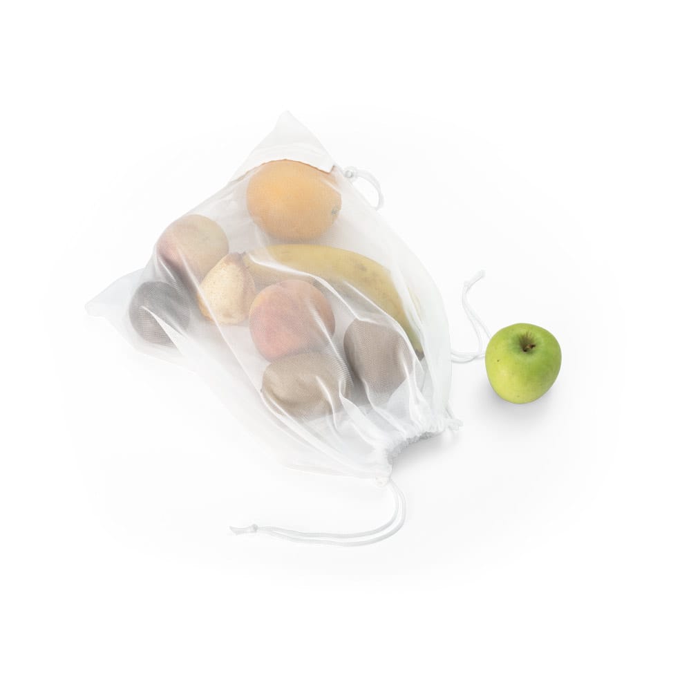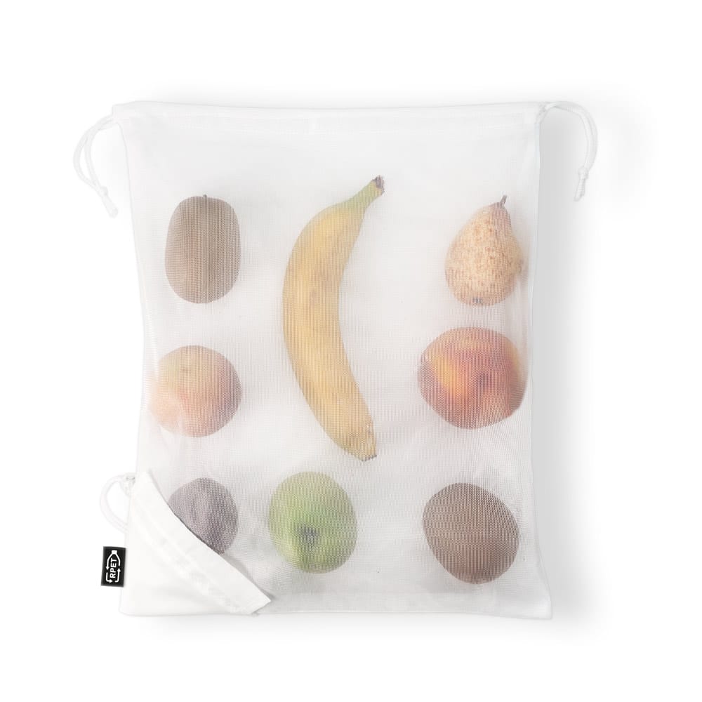 - Material principal: Sacola em malha 100% rPET, produzida a partir de garrafas plásticas recicladas
