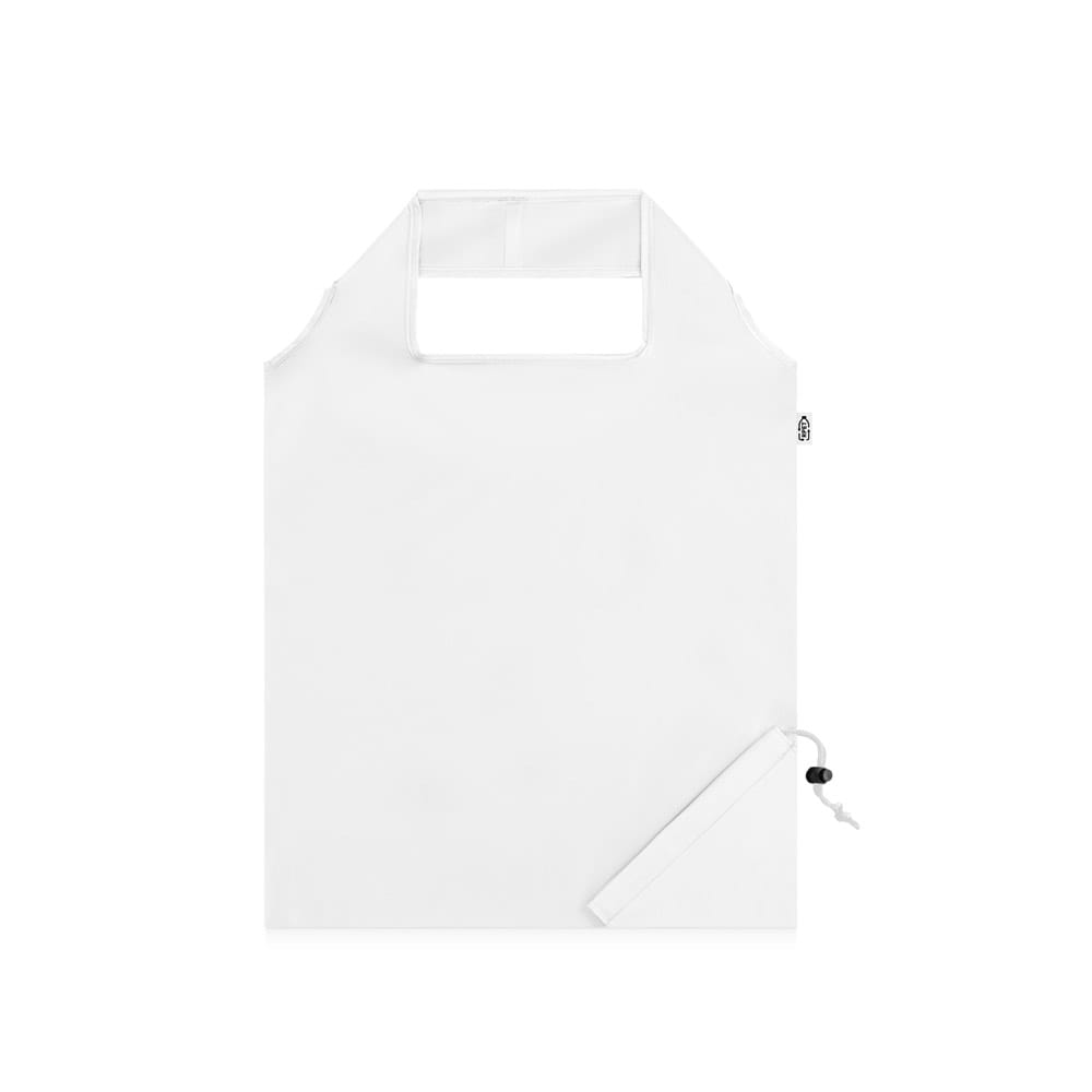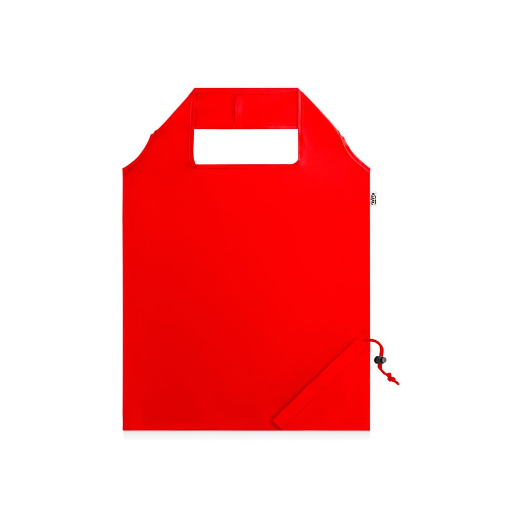 Sacola dobrável em poliéster reciclado 190T, com alças de 40 cm. Produzida a partir de plástico reciclado contribuindo para a redução dos resíduos no meio ambiente
