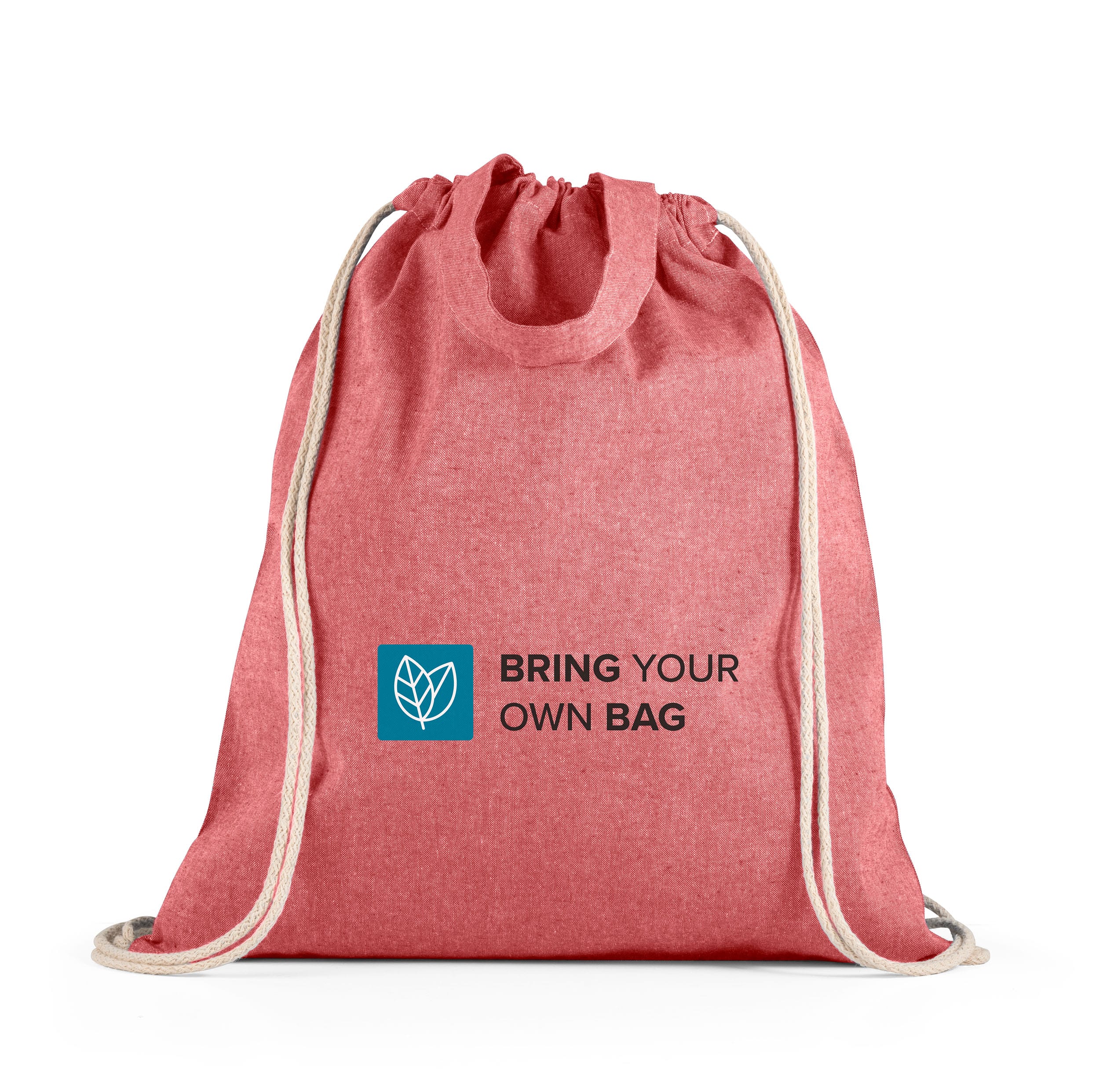 Sacola tipo mochila em 70% algodão reciclado e 30% poliéster reciclado (140g/m²), com alças 30 cm. O tecido é sem tingimento, e utilizado na sua cor original, sem produtos químicos de tingimento ou branqueamento, contribuindo para um menor impacto ambiental