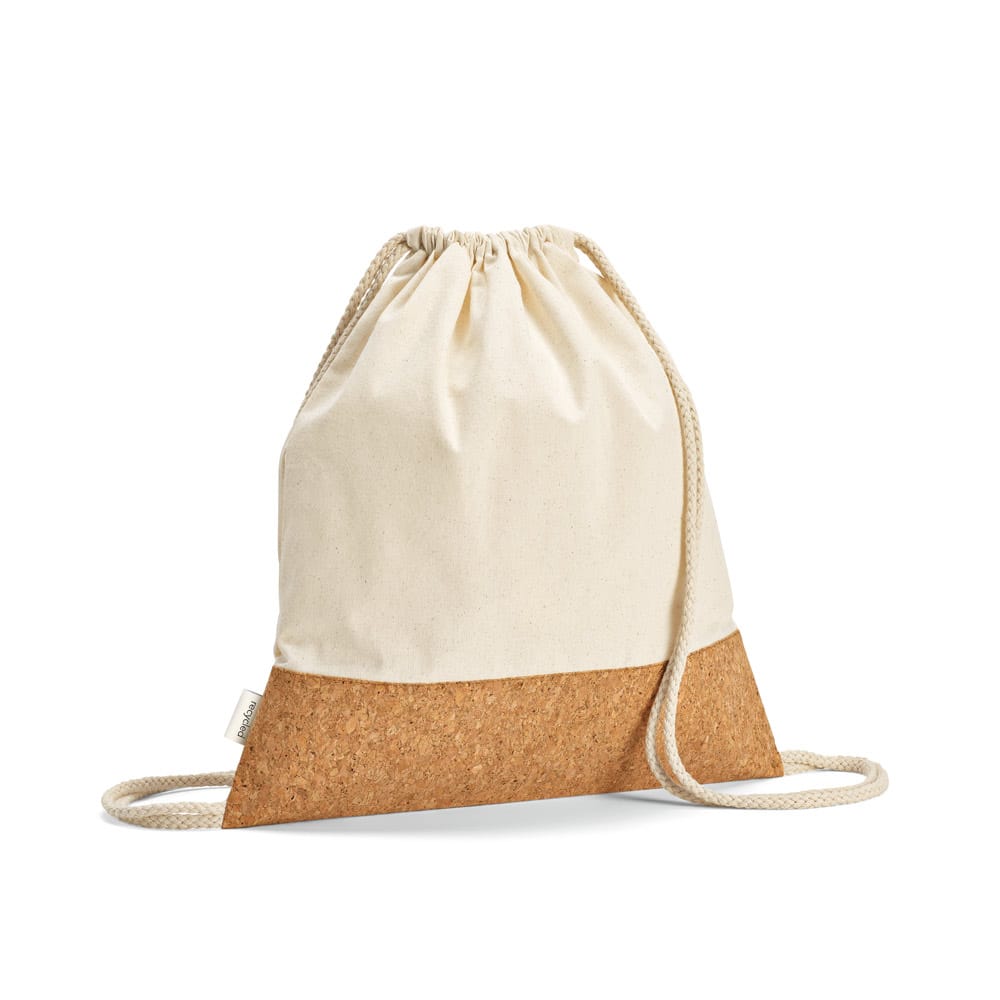 Sacola Tipo Mochila em 70% Algodão Reciclado e 30% Poliéster Reciclado (180g/m²) com Base em Cortiça