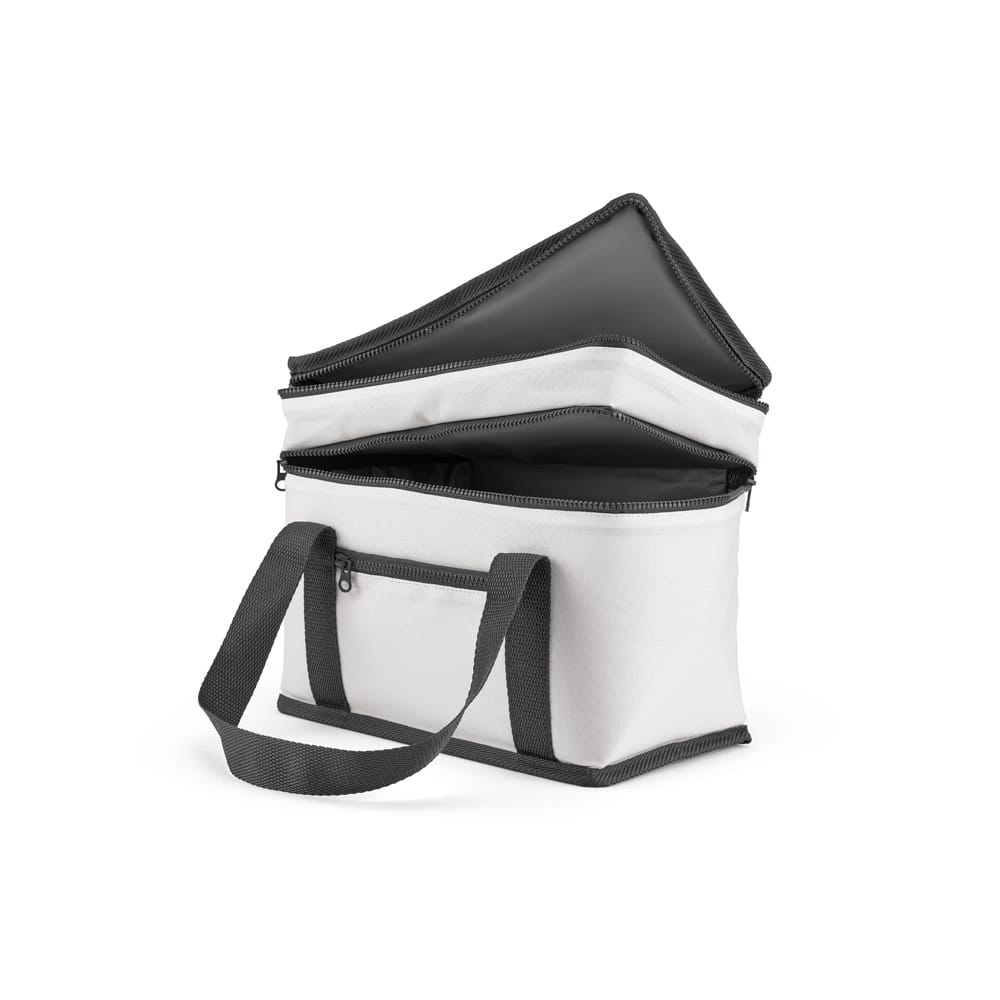 Sacola térmica em poliéster reciclado Oxford. Contém 2 compartimentos principais com isolamento em PEVA para facilitar a higienização e um bolso frontal com zíper. Capacidade até 9.5L. Certificação EU Food Grade