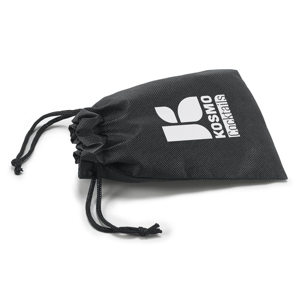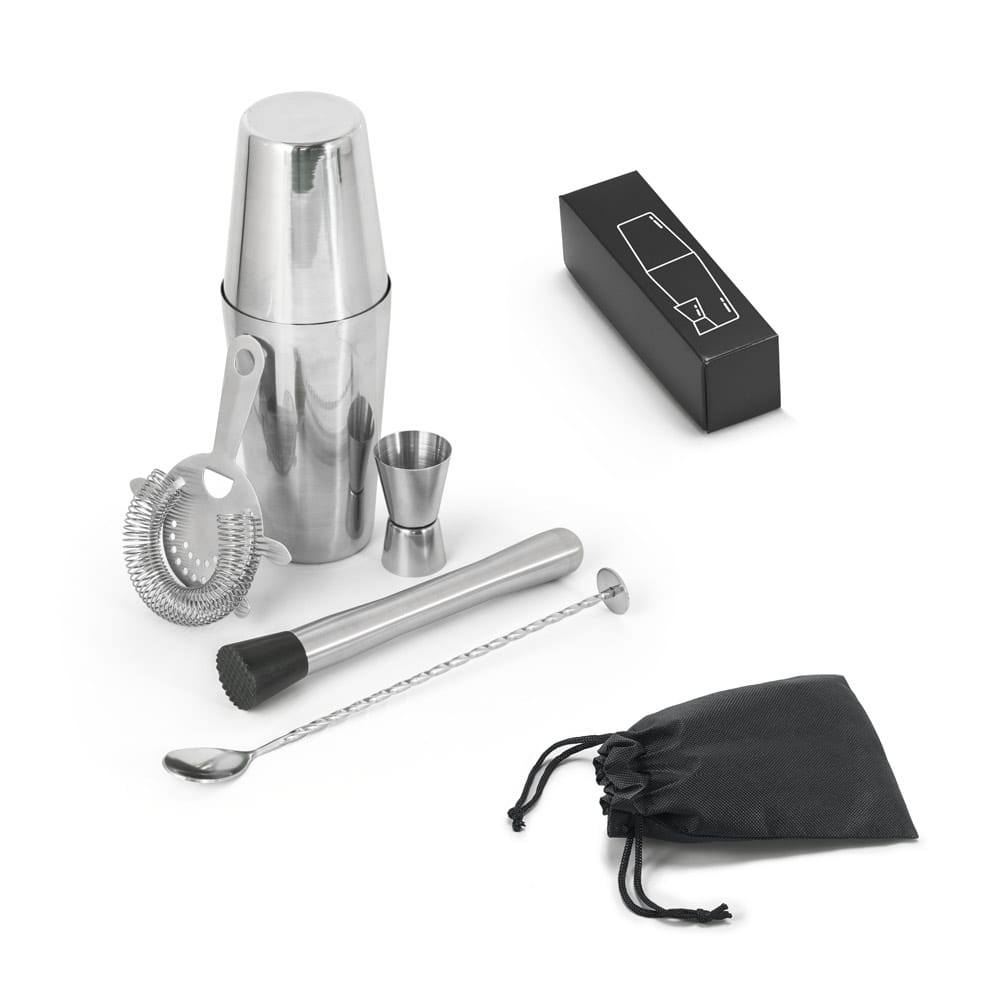Set de coquetel com 6 peças em aço inox: um shaker (600 + 450ml), um copo dosador (30ml), uma colher, um pilão e um coador. Inclusa uma bolsa em non-woven. Fornecido em caixa presente. Certificação EU Food Grade