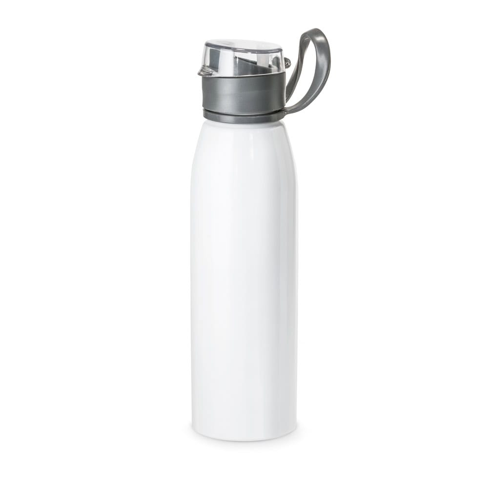 Squeeze em alumínio e tampa flip flop em AS e PP, com alça em silicone para facilitar o transporte. Capacidade até 650ml. Caixa branca 94657 vendida opcionalmente. Certificação EU Food Grade