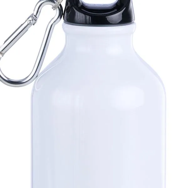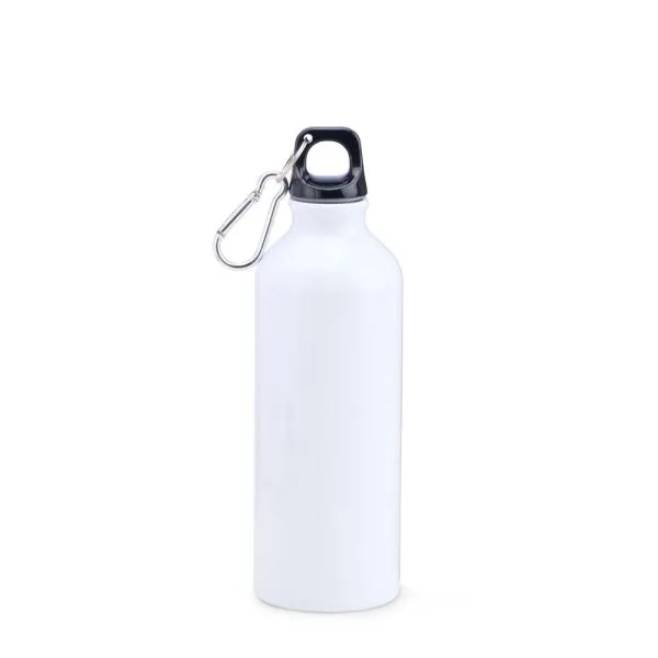 Possui tampa em polipropileno rosqueável, argola com mosquetão e anel em silicone para vedação.