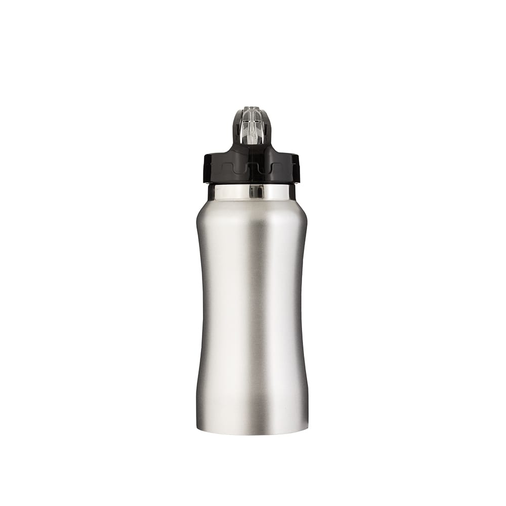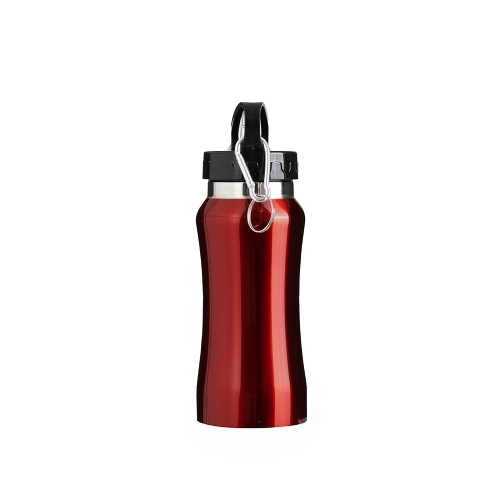 Squeeze em inox com capacidade para até 500ml. Possui tampa rosqueável em plástico com alça fixa e bico flip. Acompanha canudo interno removível e mosquetão metálico com argola.