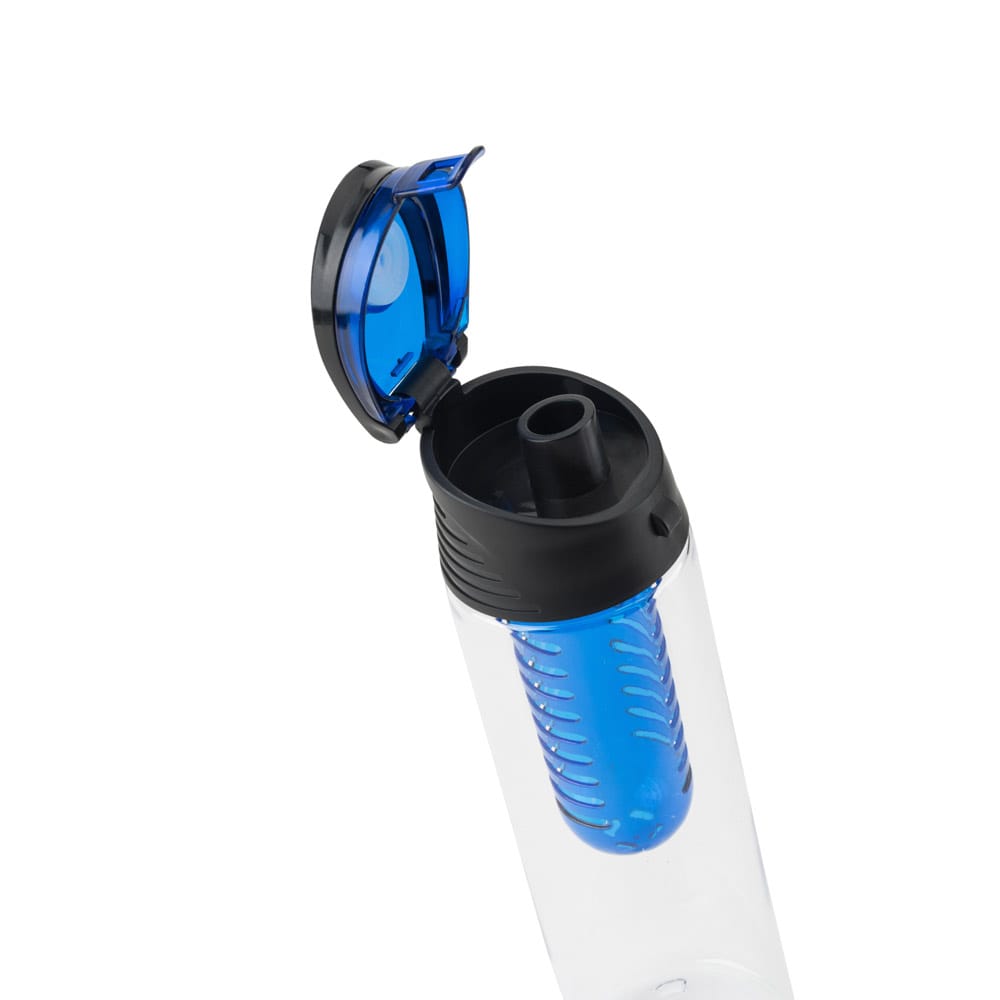 Squeeze em AS e com tampa flip top em PP, com infusor de frutas incluso. Capacidade até 740ml. Caixa branca 94657 vendida opcionalmente. Certificação EU Food Grade
