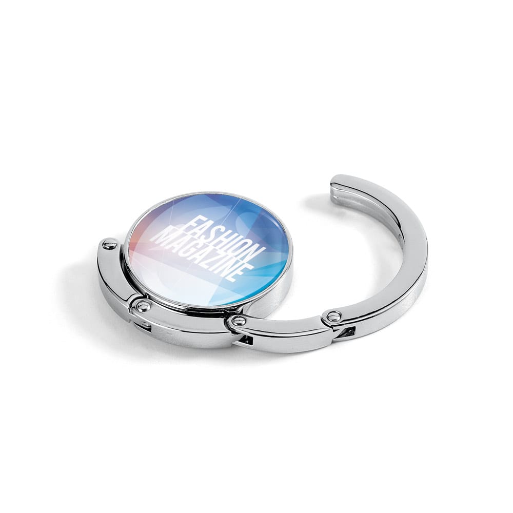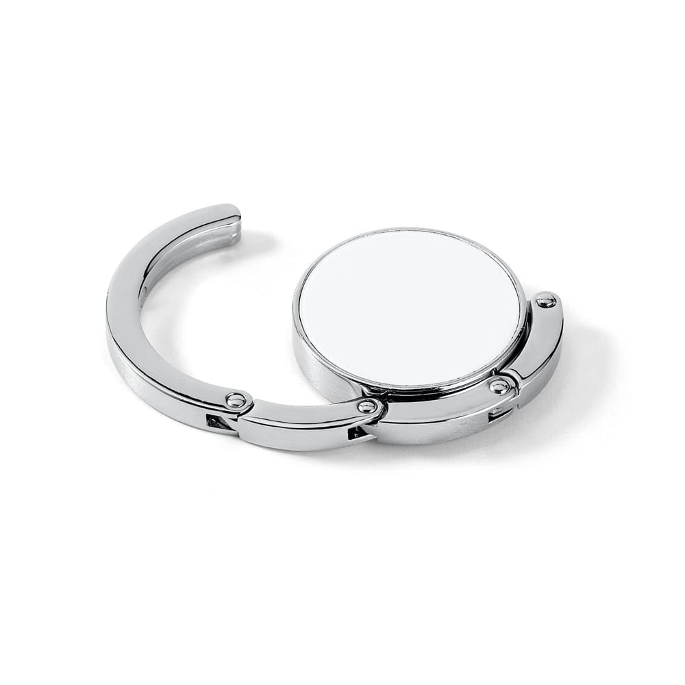Suporte de bolsa resistente em metal. O suporte pode ser colocado numa superfície para pendurar a sua bolsa. Quando está recolhido permanece junto à base devido ao seu íman
