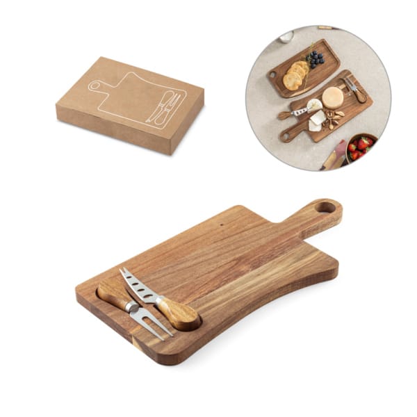 Tábua de queijos em madeira de acácia, proveniente de gestão florestal sustentável, com pega. Incluso 2 utensílios em madeira de acácia e aço inox: uma faca e um garfo, tendo uma ranhura com magnetismo para prender os talheres. Conjugue esta tábua com a Haven II – 54289 – para completar o conjunto. Fornecido em caixa presente em papel kraft reciclado. Certificação EU Food Grade. A cor e o resultado da impressão nos materiais naturais pode variar entre produtos